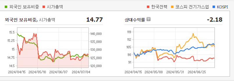 단기 포트폴리오를 구성할 때는 시가 총액과 장중 거래량도 체크해야 합니다. 한국전력의 시가 총액은 12조5953억 원이며 장중 거래량은 2,038,482원 을 기록했습니다. 대주주의 정보는 크게 중요하지 않지만 장기적인 관점에서는 확인이 필요합니다.