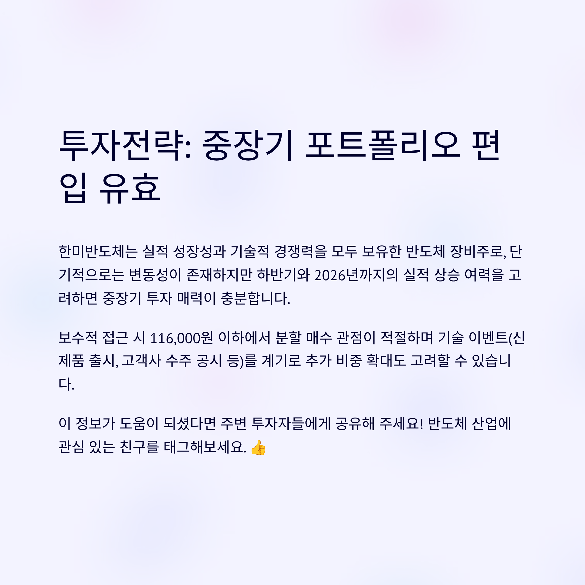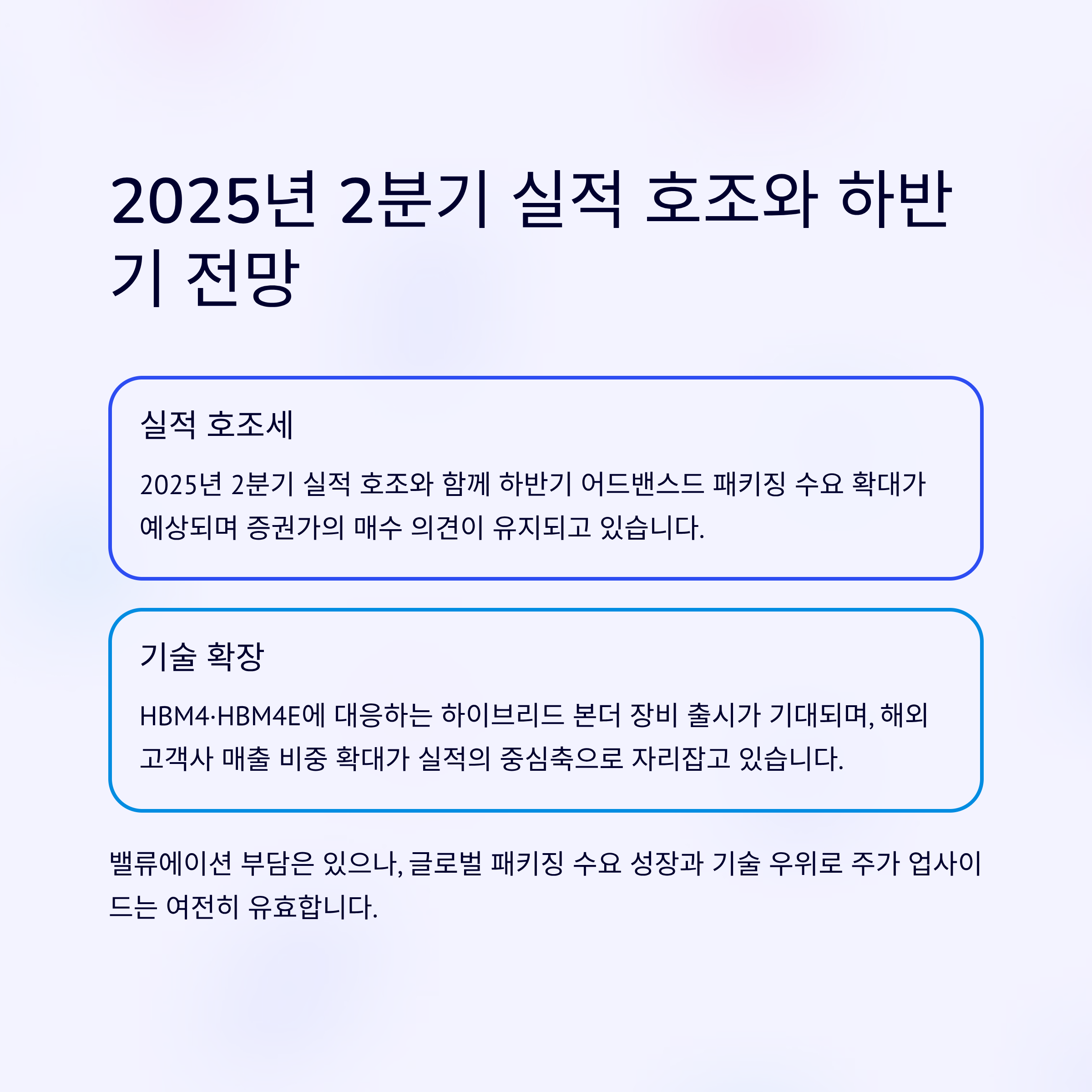 한미반도체는 2025년 2분기 실적 호조세와 함께 하반기 어드밴스드 패키징 수요 확대가 예상되며 증권가의 매수 의견이 유지되고 있습니다. 특히 HBM4·HBM4E에 대응하는 하이브리드 본더 장비 출시가 기대되며, 해외 고객사 매출 비중 확대가 실적의 중심축으로 자리잡고 있습니다. 밸류에이션 부담은 있으나, 글로벌 패키징 수요 성장과 기술 우위로 주가 업사이드는 여전히 유효합니다.