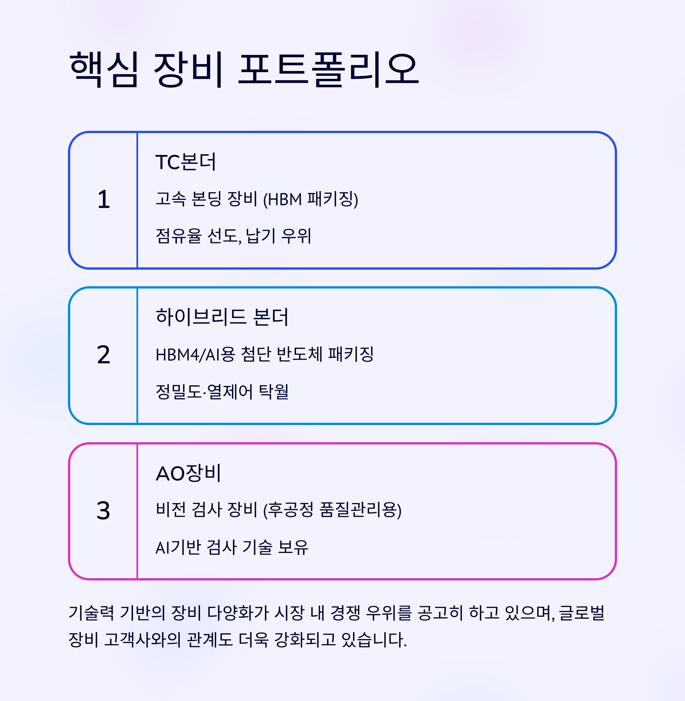 | TC본더 | 고속 본딩 장비 (HBM 패키징) | 점유율 선도, 납기 우위 |