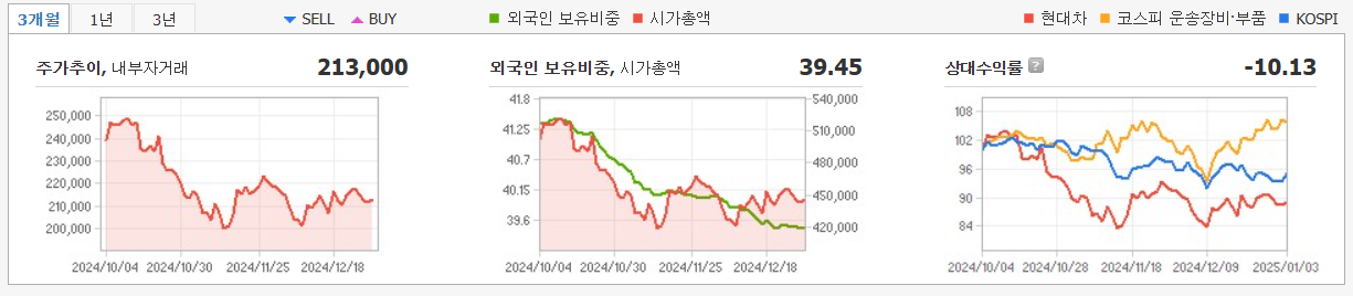 현대차의 현재 주가는 213,000원입니다. 전일 대비 -0.70원 이동한 모습입니다. 시가 총액은 44조6056억 원이며 발행 주식은 총 209,416,191주 입니다. 외국인이 보유한 비중은 39.45%입니다. 현대차 기업의 영업이익은 억 원을 달성했으며 배당 수익율은 5.60% 입니다.
