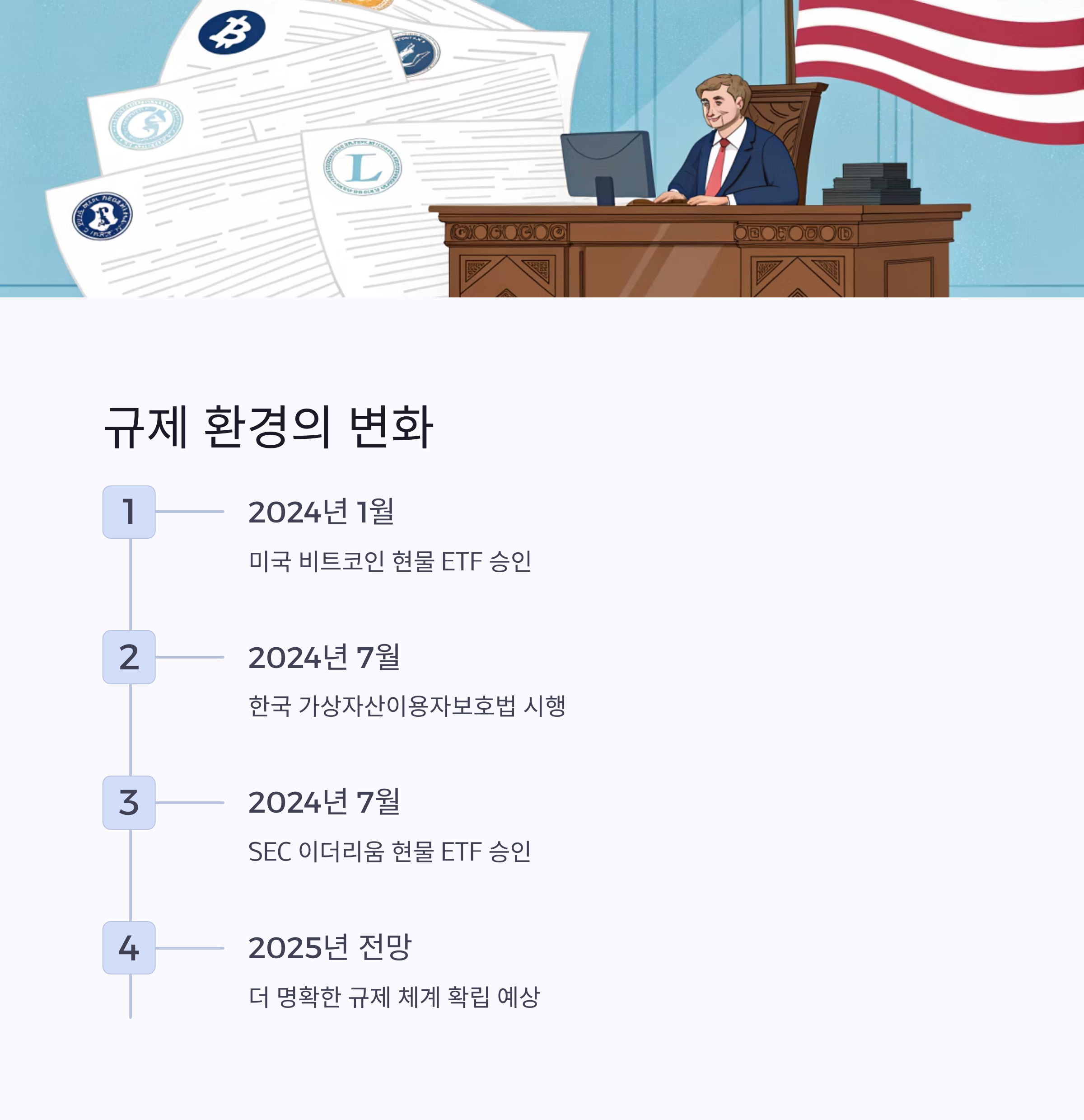 한국의 「가상자산이용자보호법」 시행과 미국의 이더리움 ETF 승인은 규제 명확화의 대표 사례입니다.