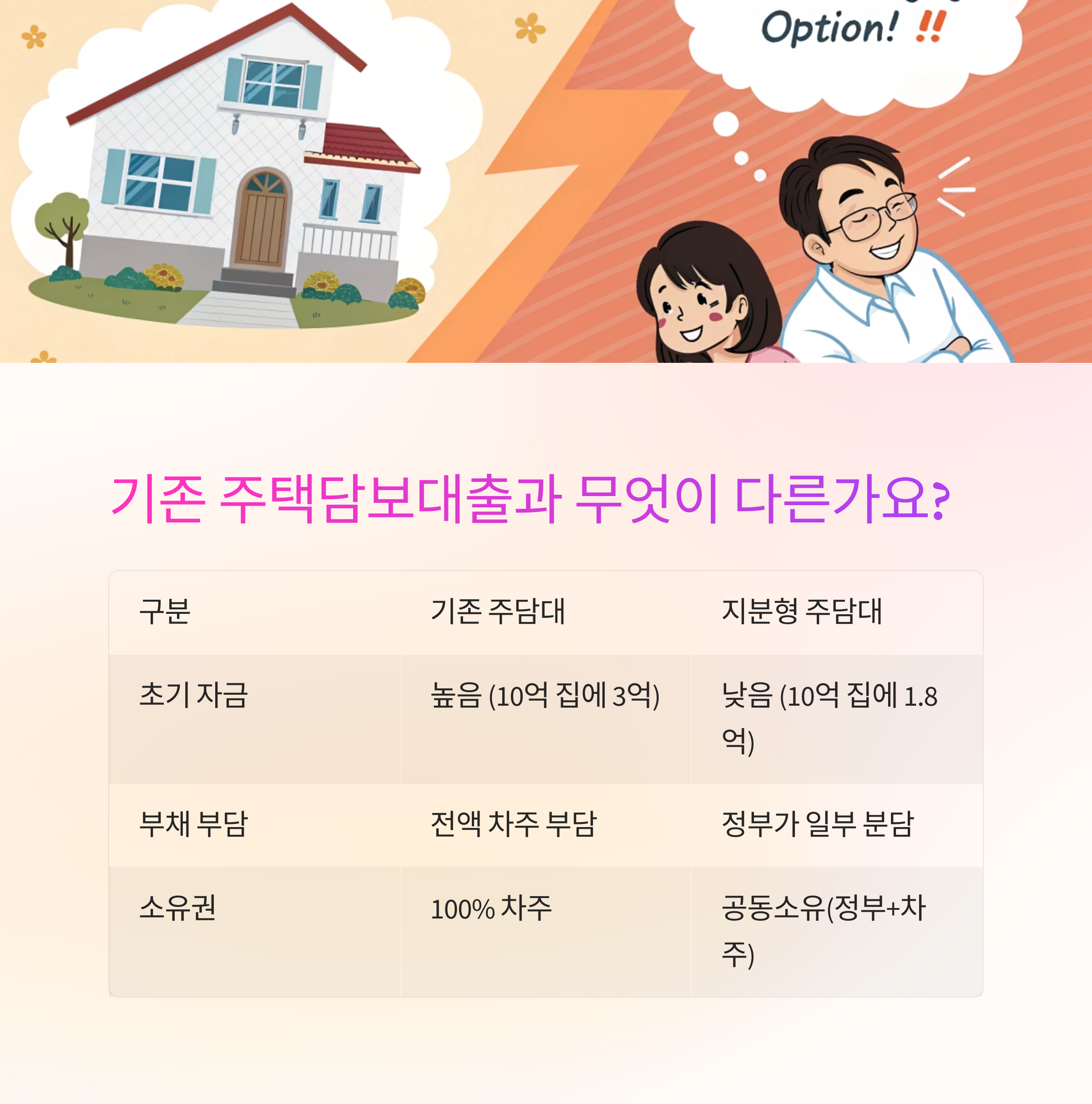 | 구분 | 기존 주담대 | 지분형 주담대 |