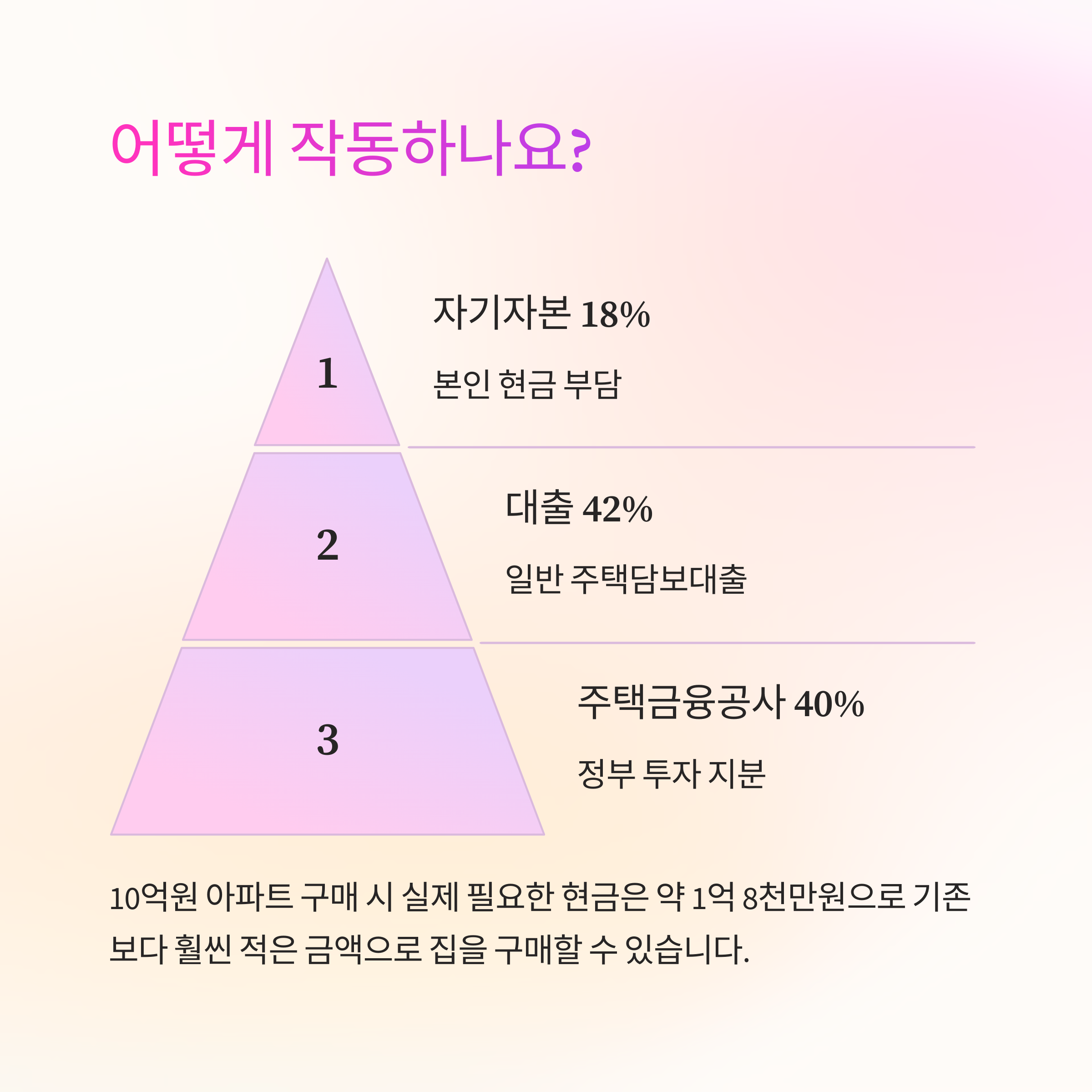 지분형 주택담보대출의 기본 구조는 "자기자본 18% + 대출 42% + 주택금융공사 40%"로 설계되어 있습니다. 예를 들어, 10억 원짜리 아파트를 구매할 경우: