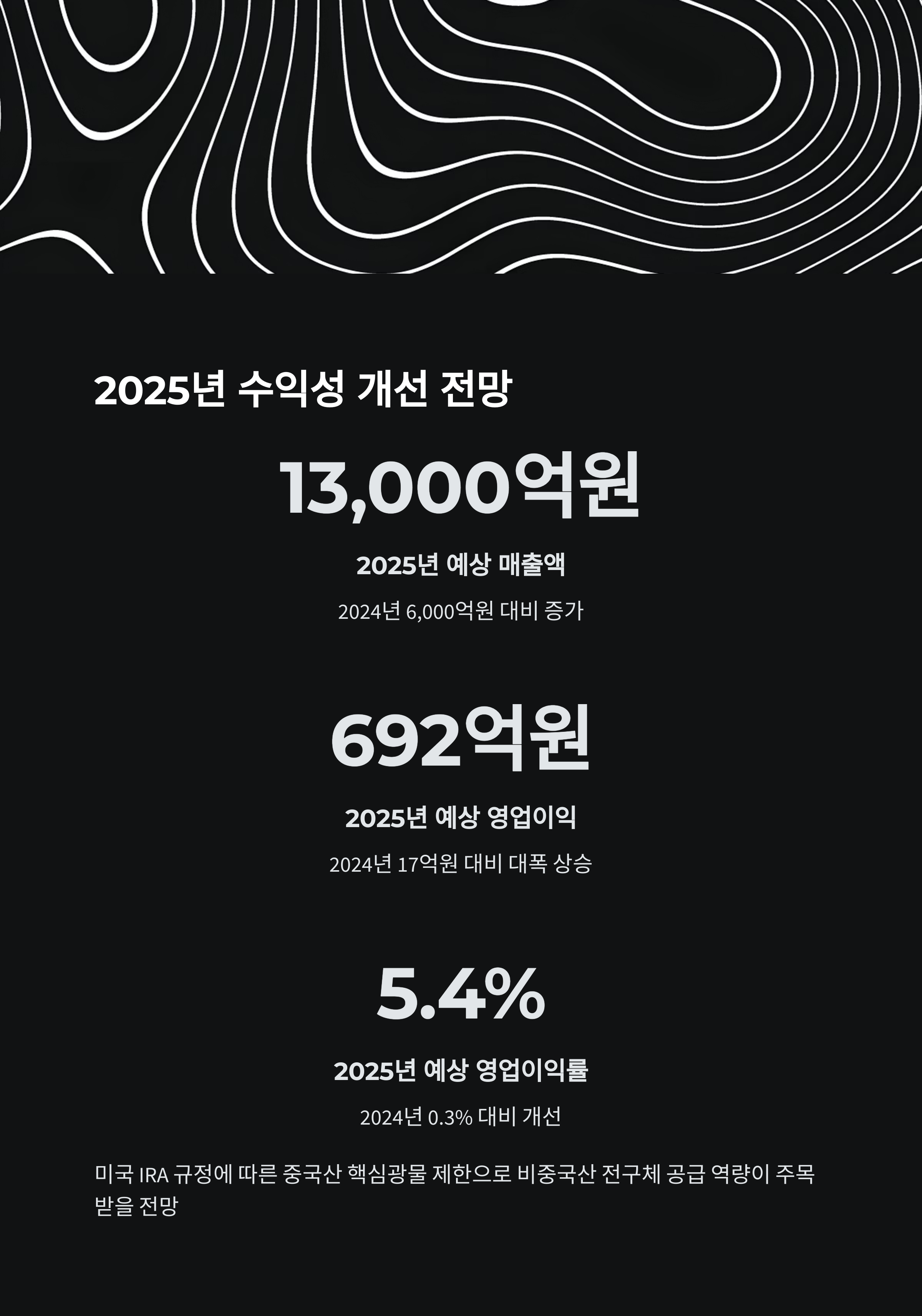 에코프로머티는 2024년 이차전지 업종 전반의 불황과 고객사 재고 조정의 영향을 직격탄으로 맞으며 연간 매출이 37% 급감하고 영업이익률은 0.3% 수준까지 추락했습니다. 그러나 2025년 미국 IRA(인플레이션 감축법) 시행 본격화에 따라 중국 외 전구체 공급 기업으로의 주목도가 높아질 전망이며, 에코프로머티는 이 수혜의 중심에 서게 될 가능성이 높습니다.