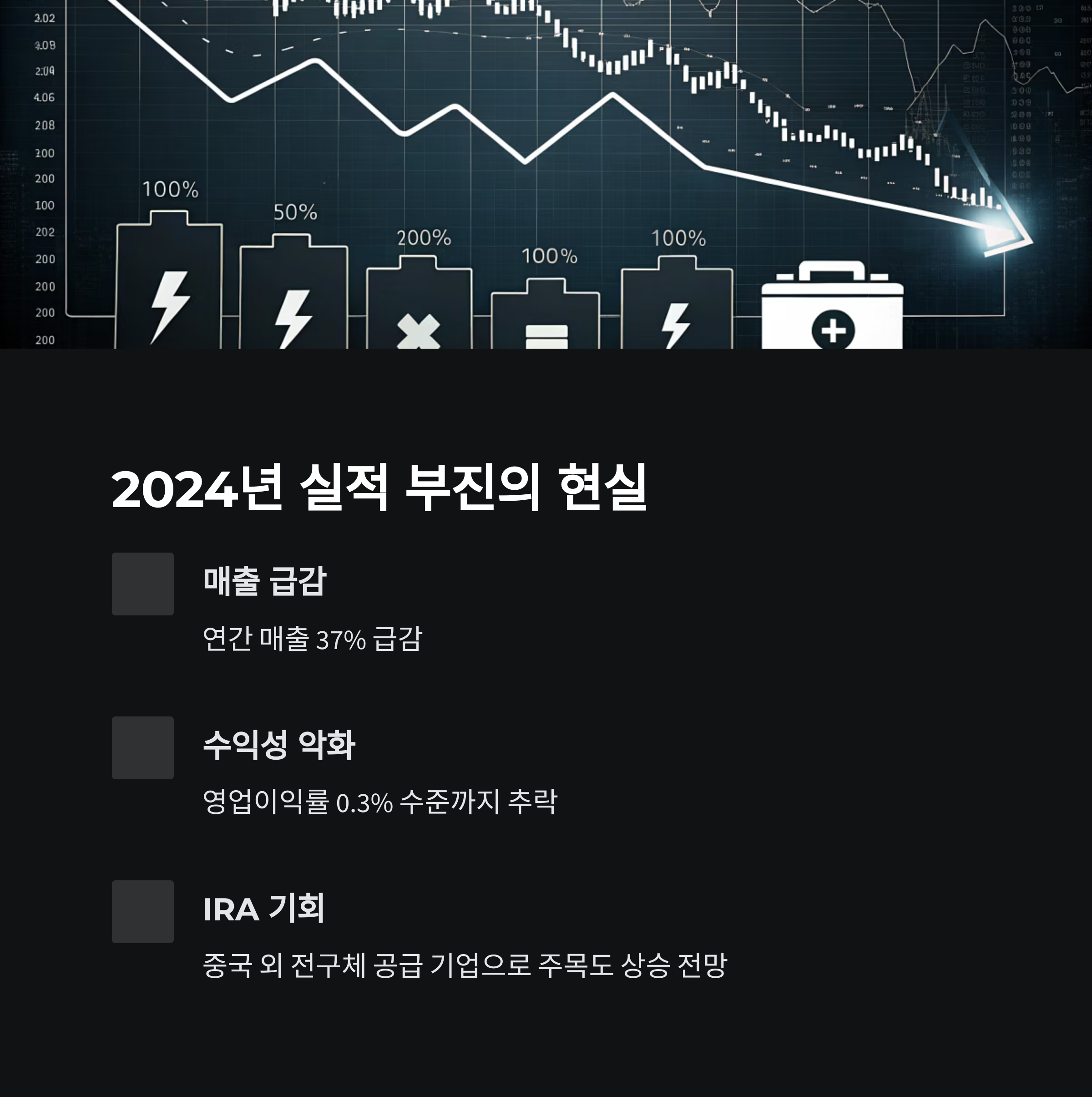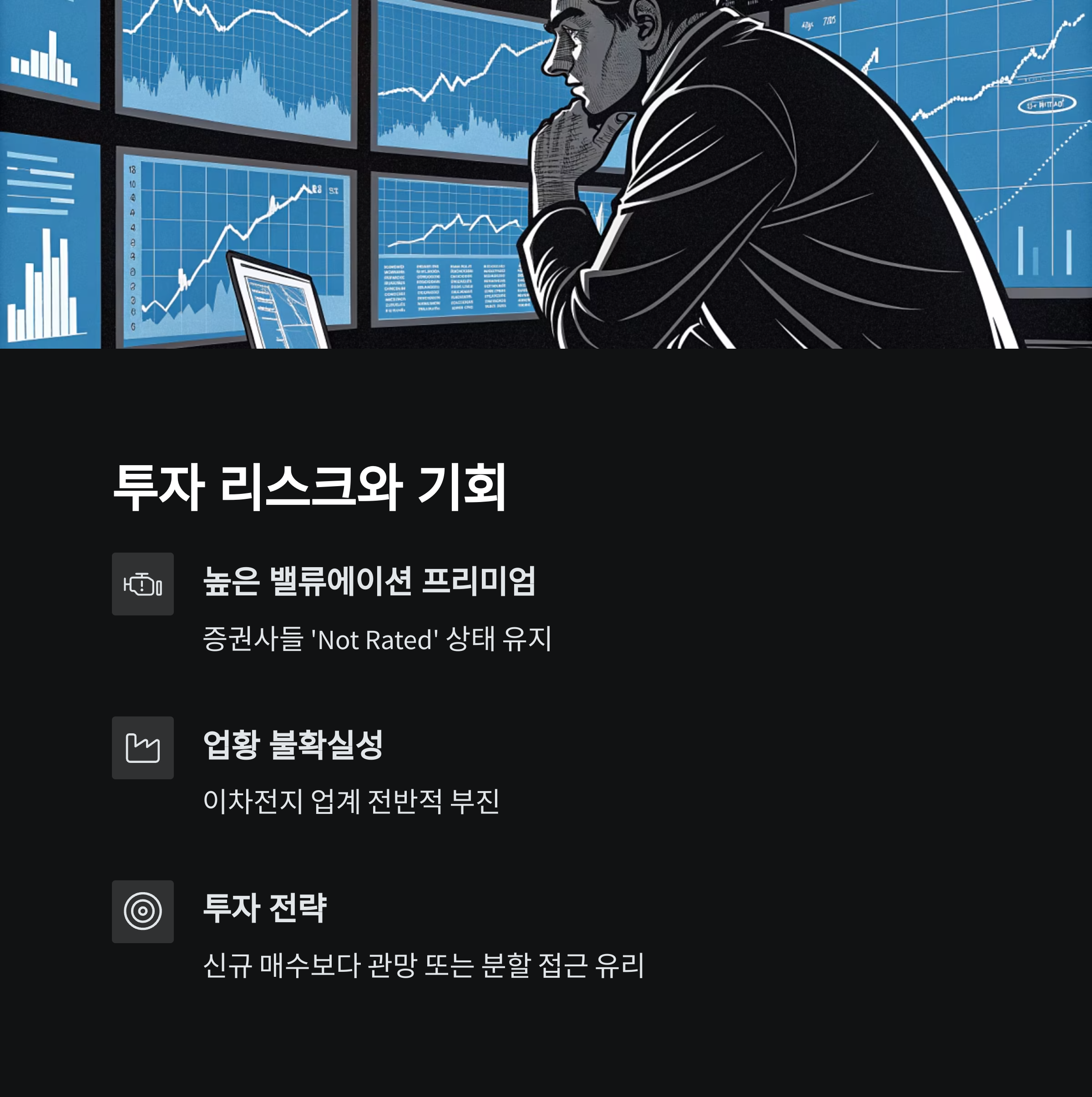 2025년 주가 전망은 실적 개선 가시화 여부에 크게 좌우될 것입니다. 다만 증권사들이 여전히 'Not Rated' 상태를 유지하고 있다는 점은 높은 밸류에이션 프리미엄과 업황 불확실성을 반영하고 있습니다. 현재 주가는 IRA 효과, 신규 고객 확대 등 긍정적 요인을 선반영한 측면이 있어 신규 매수보다는 관망 또는 분할 접근이 유리한 국면으로 해석됩니다.