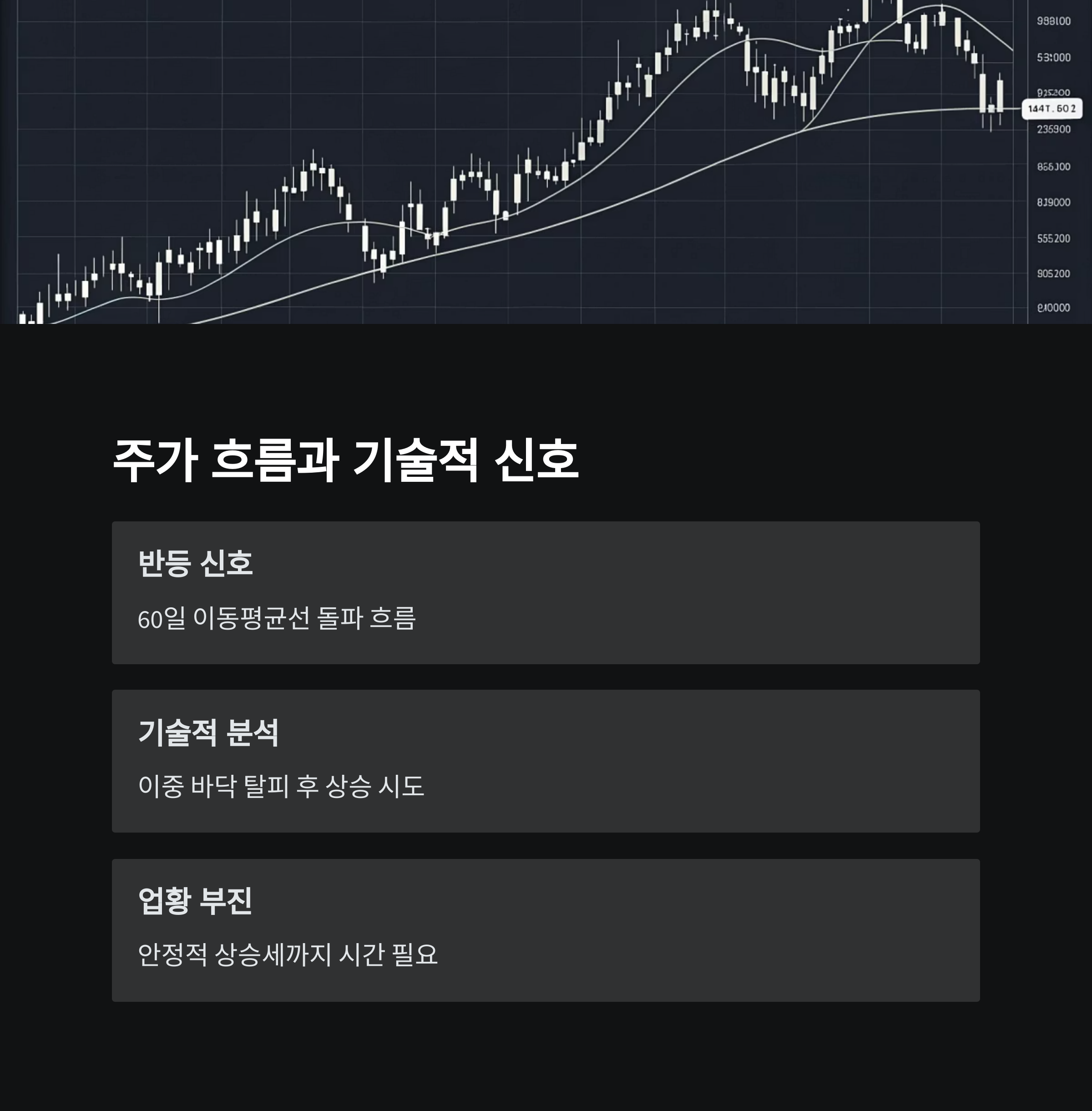 최근 주가는 41,850원까지 저점을 기록한 뒤 반등세를 보이며 60일 이동평균선을 돌파하는 흐름이 나타나고 있습니다. 이는 일부 기술적 분석에서 '이중 바닥 탈피 후 상승 시도'로 해석되고 있으며, 단기 투자자들의 매수심리 회복 가능성도 엿보입니다. 하지만 여전히 이차전지 업황의 전반적 부진 속에 있기 때문에 안정적 상승세로 이어지기까지는 시간이 필요하다는 분석이 지배적입니다.