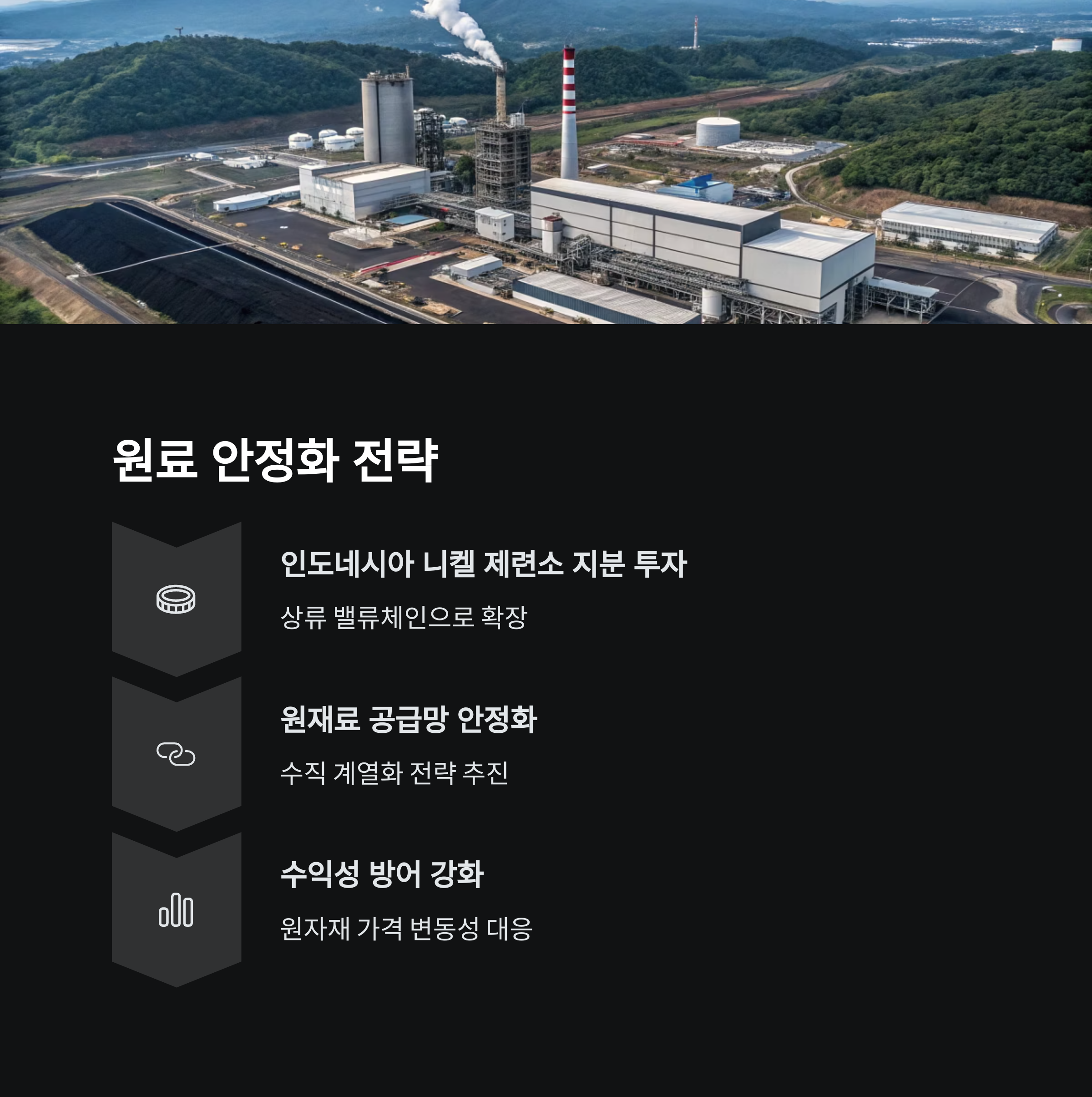 에코프로머티는 최근 인도네시아 니켈 제련소 지분 투자를 단행하며 상류 밸류체인으로의 확장을 통해 원재료 공급망 안정화에 나서고 있습니다. 이러한 수직 계열화 전략은 원자재 가격 변동성 대응뿐만 아니라 장기적으로는 수익성 방어에도 큰 힘이 될 것으로 분석됩니다.