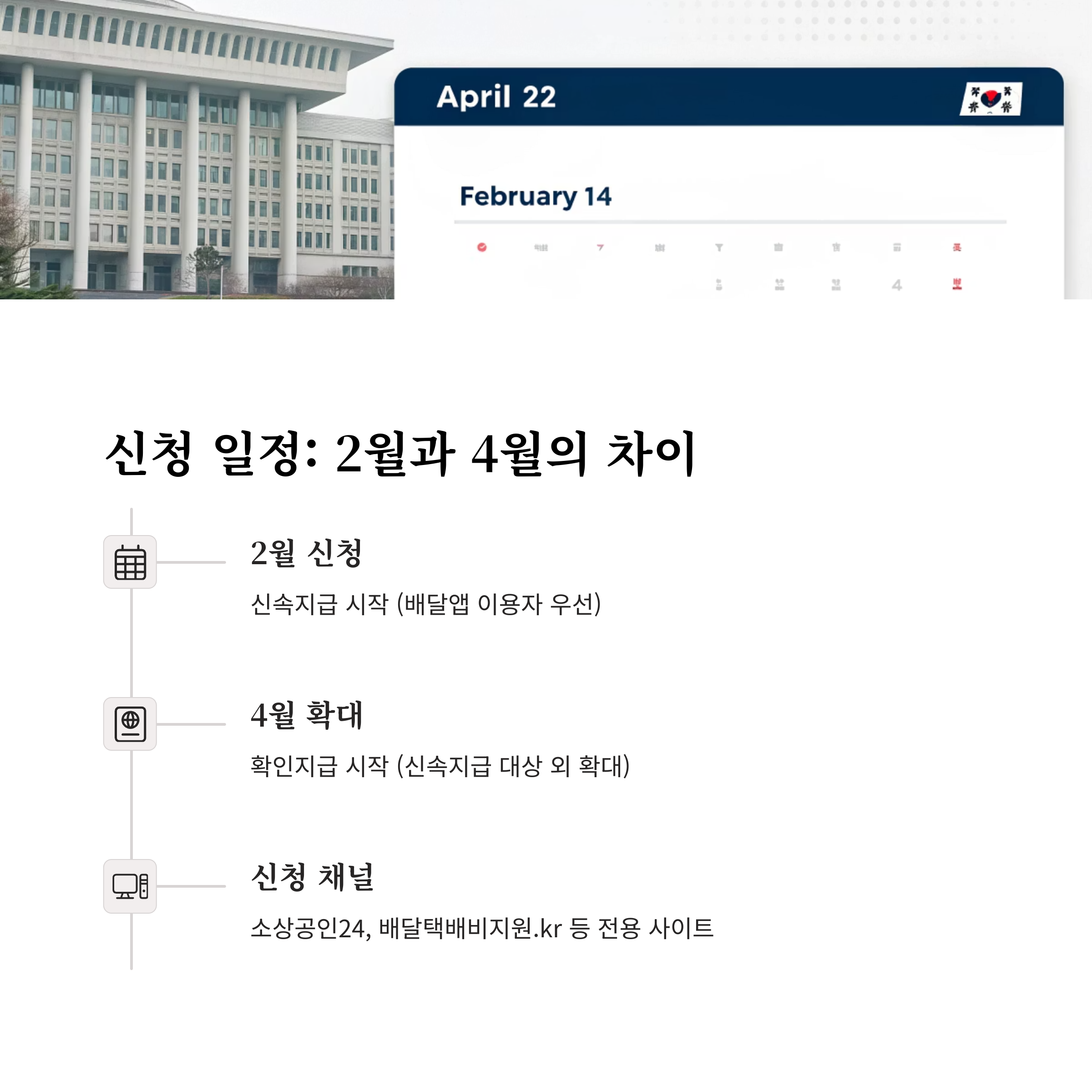 배달의민족, 요기요, 쿠팡이츠 등 "주요 6개사 앱을 이용한 경우" 2월부터 신청 가능하며, 그 외 직접 배달 사업자는 4월부터 신청할 수 있습니다