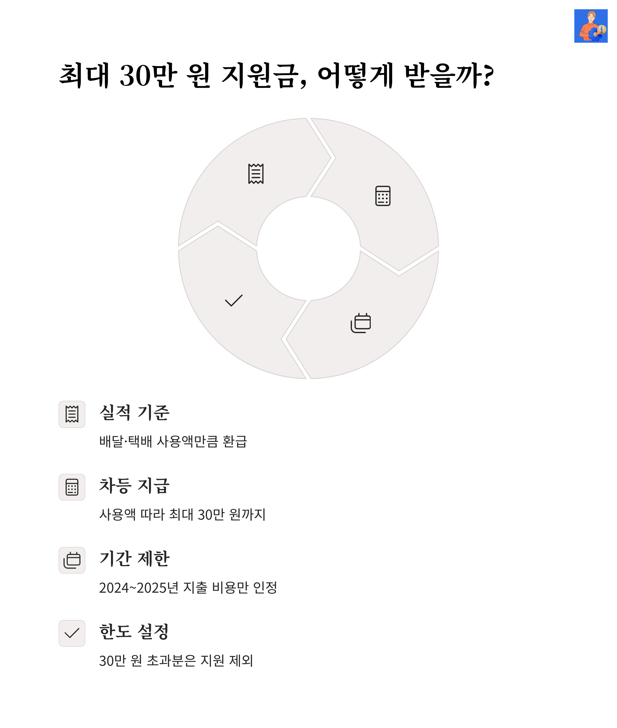 2024년 1월부터 2025년 2월 사이 배달·택배 실적을 기준으로 "실적만큼 최대 30만 원까지 지원"되는 구조입니다