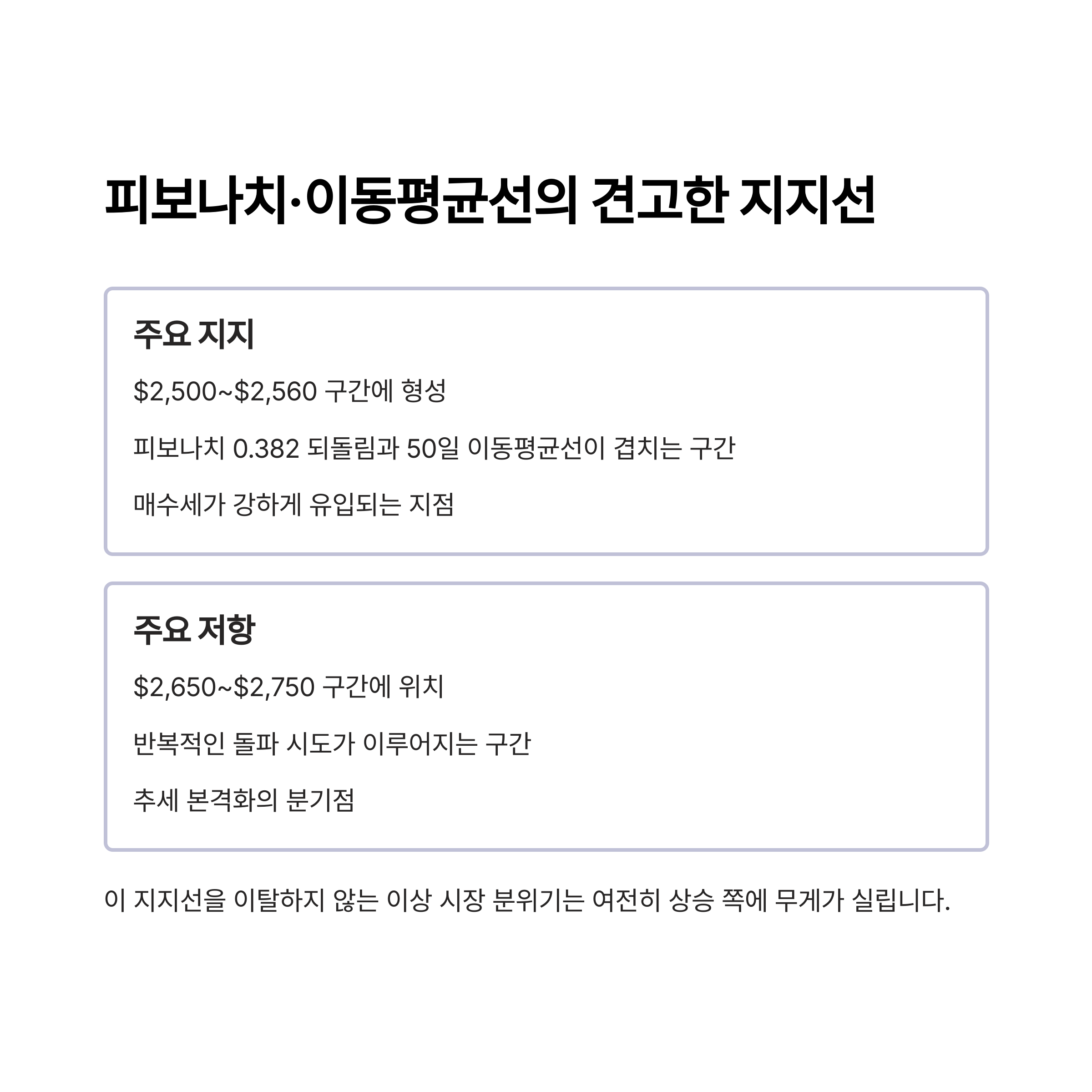 | 주요 지지 | $2,500~$2,560 | 피보나치+50MA 결집, 매수세 집중 |