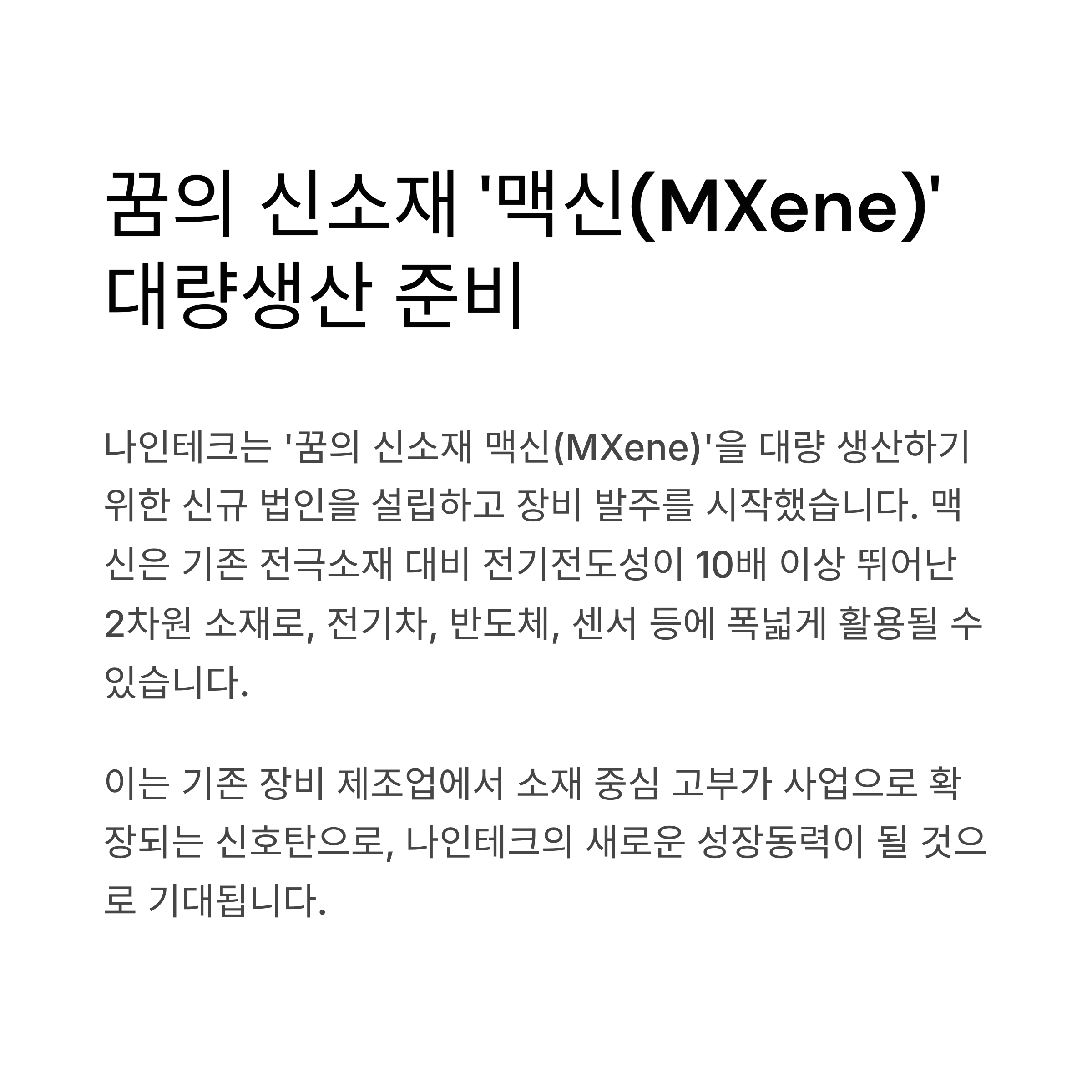 나인테크는 꿈의 신소재 맥신(MXene)을 대량 생산하기 위한 신규 법인을 설립하고 장비 발주를 시작했습니다. 맥신은 기존 전극소재 대비 전기전도성이 10배 이상 뛰어난 2차원 소재로, 전기차, 반도체, 센서 등에 폭넓게 활용될 수 있습니다.