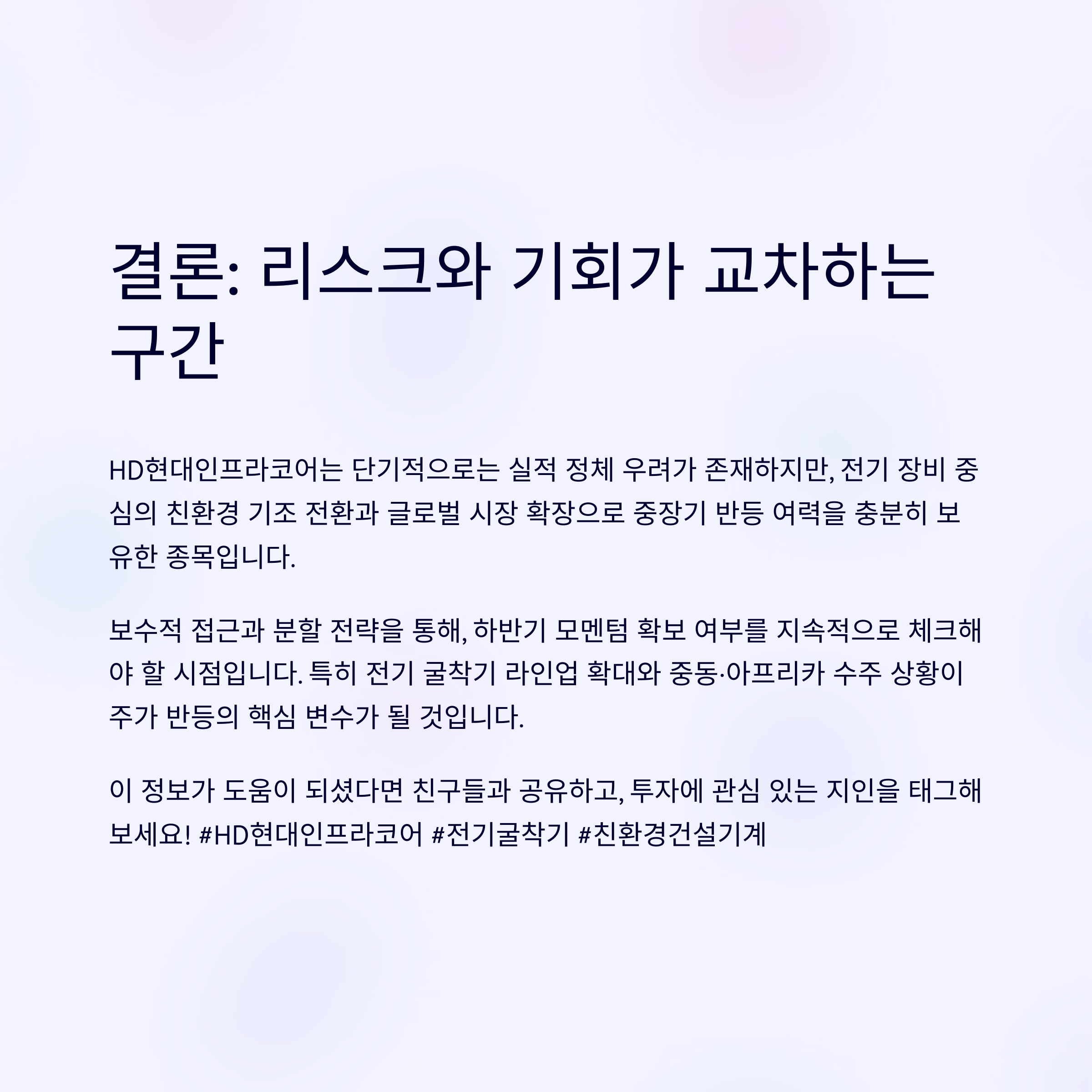 HD현대인프라코어는 단기적으로는 실적 정체 우려가 존재하지만, 전기 장비 중심의 친환경 기조 전환과 글로벌 시장 확장으로 중장기 반등 여력을 충분히 보유한 종목입니다. 보수적 접근과 분할 전략을 통해, 하반기 모멘텀 확보 여부를 지속적으로 체크해야 할 시점입니다.