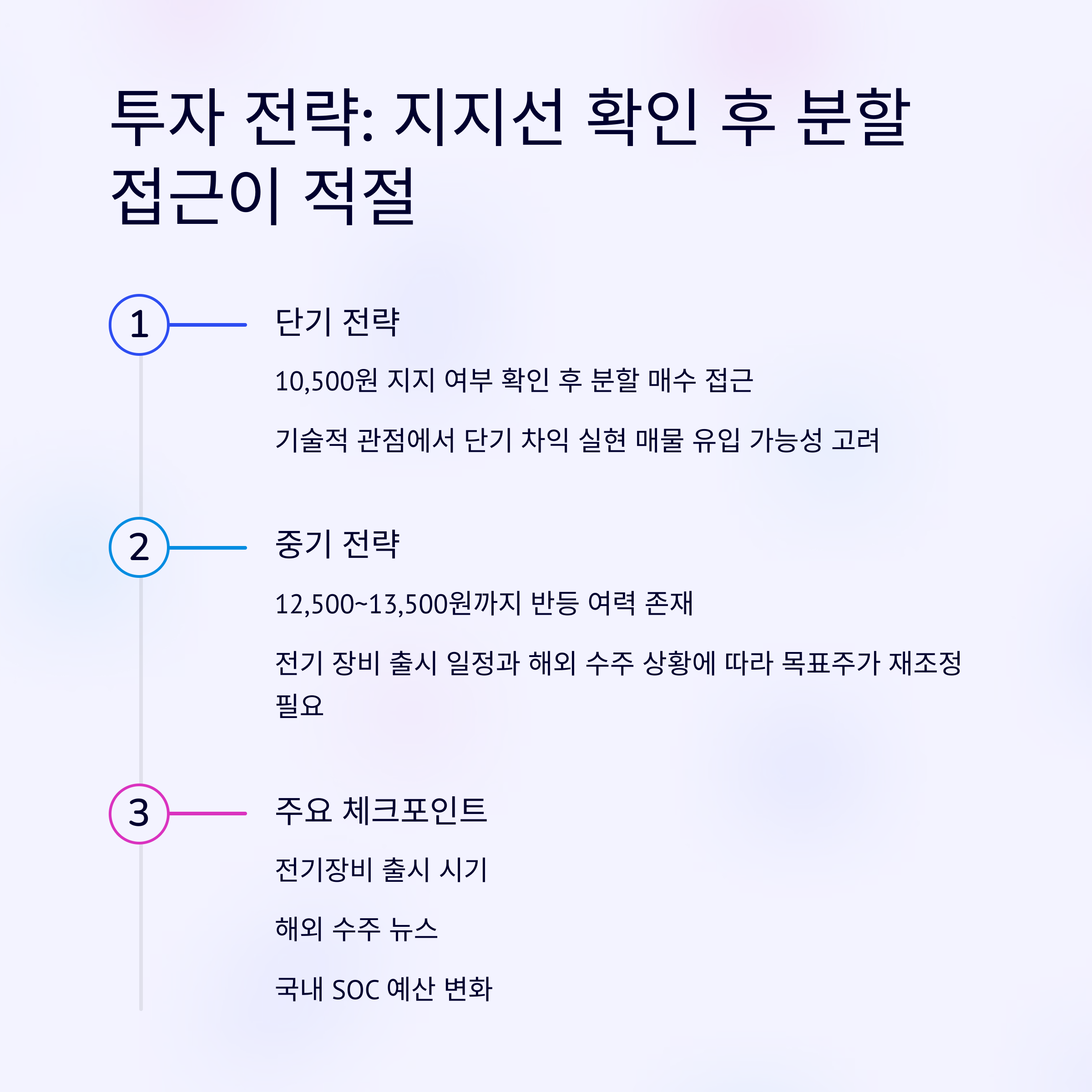 현재 주가는 애널리스트 목표가를 상회하고 있어, 기술적 관점에서 단기 차익 실현 매물이 유입될 수 있습니다. 10,500원대 이하 지지 여부를 확인한 후 분할 매수 접근이 바람직하며, 전기 장비 출시 일정과 해외 수주 상황에 따라 목표주가 재조정이 필요합니다.