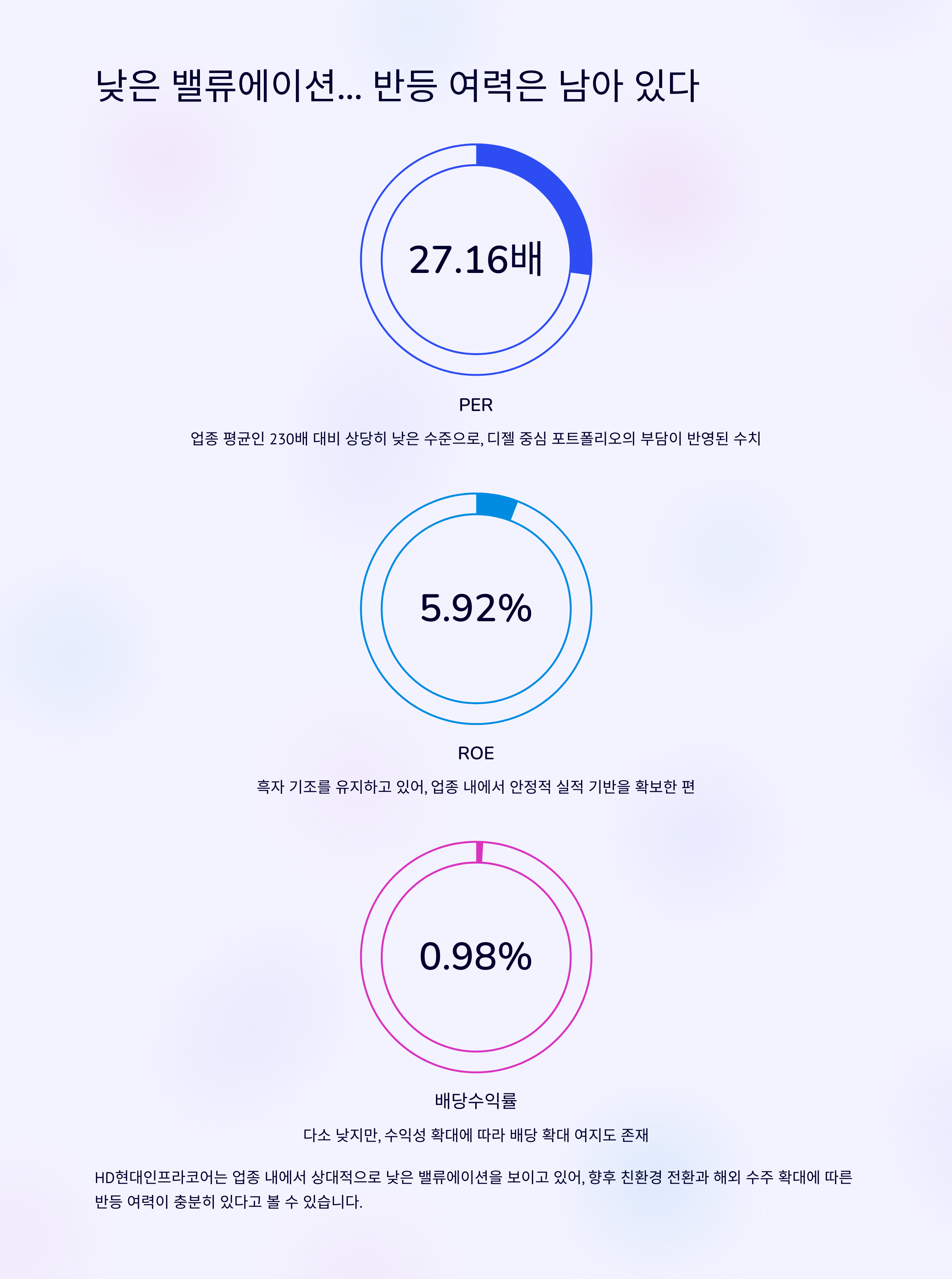 PER 27.16배는 업종 평균인 230배 대비 상당히 낮으며, 이는 디젤 중심 포트폴리오의 부담이 반영된 수치입니다. 하지만 ROE는 5.92%로 흑자 기조를 유지하고 있어, 업종 내에서 안정적 실적 기반을 확보한 편에 속합니다.