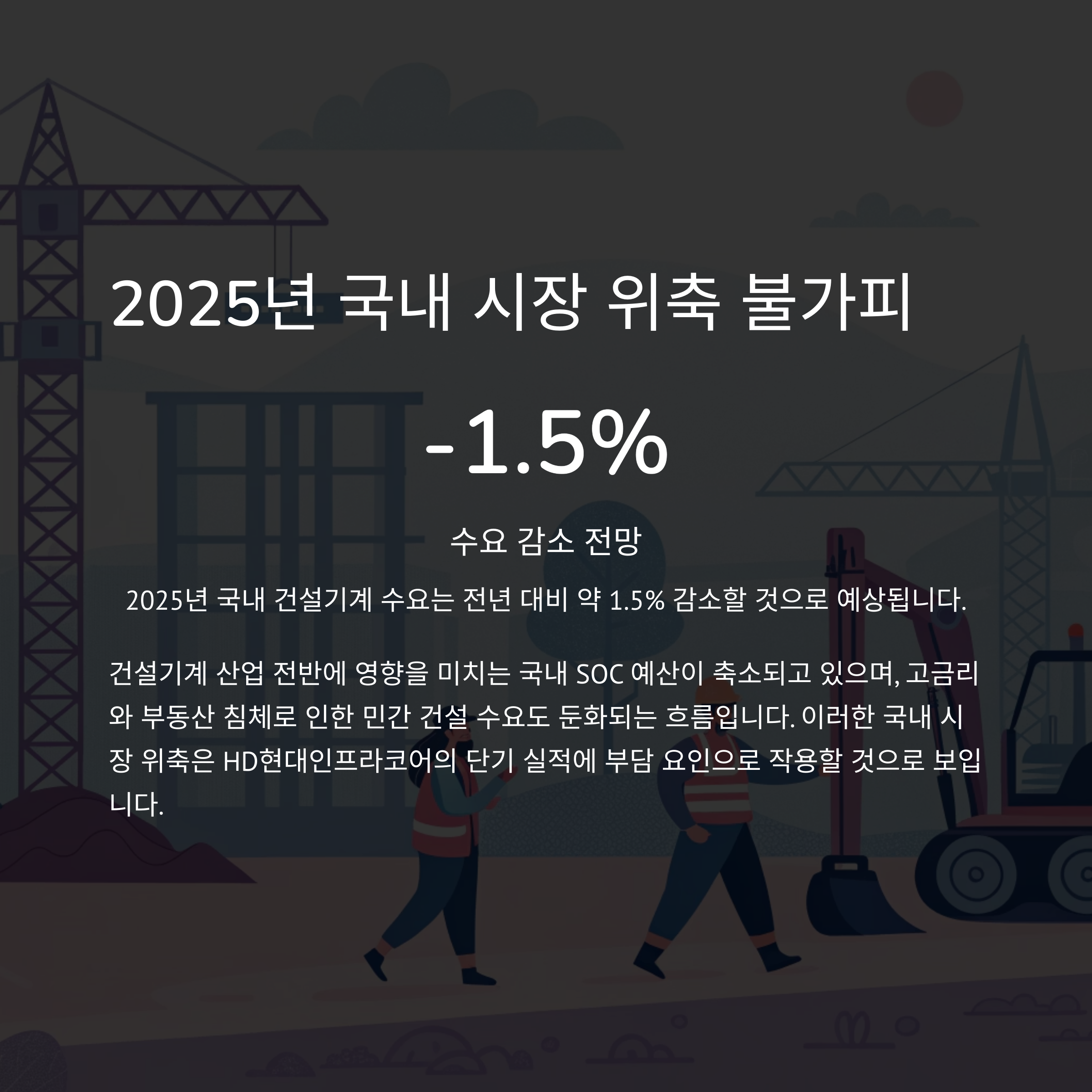건설기계 산업 전반에 영향을 미치는 국내 SOC 예산이 축소되고 있으며, 고금리·부동산 침체로 인한 민간 건설 수요도 둔화되는 흐름입니다. 이에 따라 2025년 국내 건설기계 수요는 전년 대비 약 1.5% 감소할 것으로 보입니다.
