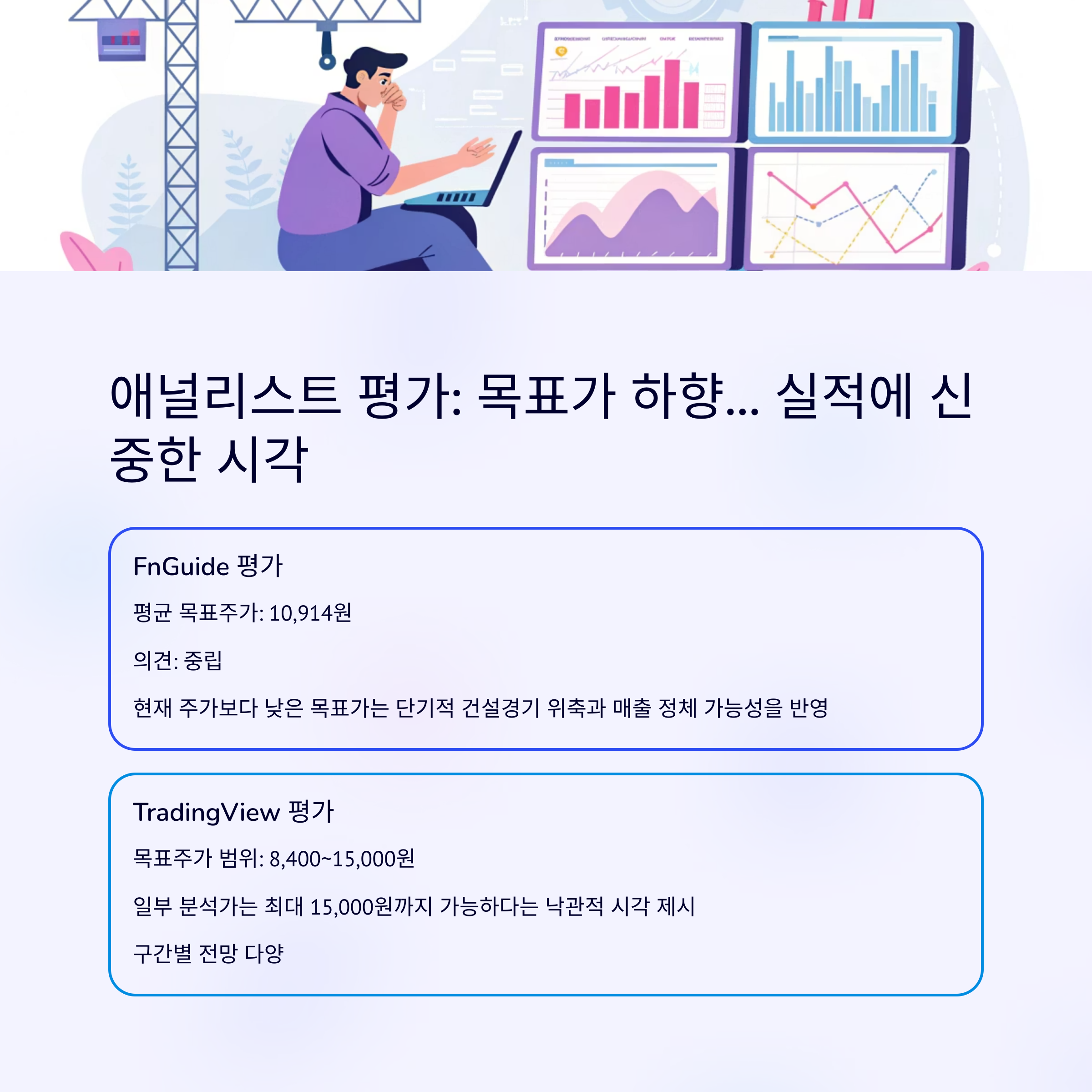 에프앤가이드 기준 평균 목표주가는 10,914원으로, 현재 주가보다 낮습니다. 이는 단기적으로 국내외 건설경기 위축과 매출 정체 가능성을 반영한 것으로 보입니다. 다만 트레이딩뷰 기준 일부 분석가는 최대 15,000원까지도 가능하다는 낙관적 시각도 제시하고 있습니다.