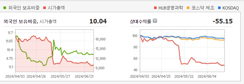시가 총액과 장중 거래량을 살펴보면 단기 포트폴리오 구성에 도움이 됩니다. HLB생명과학의 시가 총액은 1조1455억 원이며 장중 거래량은 429,808원 을 기록했습니다. 대주주의 정보는 크게 중요하지 않지만 장기적인 관점에서는 확인해보는 것이 좋습니다.