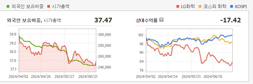 시가 총액과 장중 거래량을 살펴봐야 단기 포트폴리오를 구성할 수 있습니다. LG화학의 시가 총액은 24조9191억 원이며 장중 거래량은 245,435원 을 기록했습니다. 대주주의 정보는 크게 중요하지 않을 수 있으나 장기적인 관점에서는 확인해보는 것이 좋겠습니다.