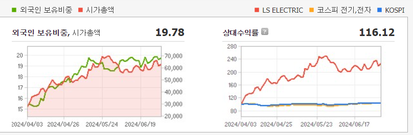 시가 총액과 장중 거래량도 단기 포트폴리오를 구성할 때 체크해야 합니다. LS ELECTRIC의 시가 총액은 6조1050억 원이며 장중 거래량은 951,442원 을 기록했습니다. 대주주의 정보는 크게 중요하지 않지만 장기적인 관점에서는 확인해보는 것이 좋겠습니다.