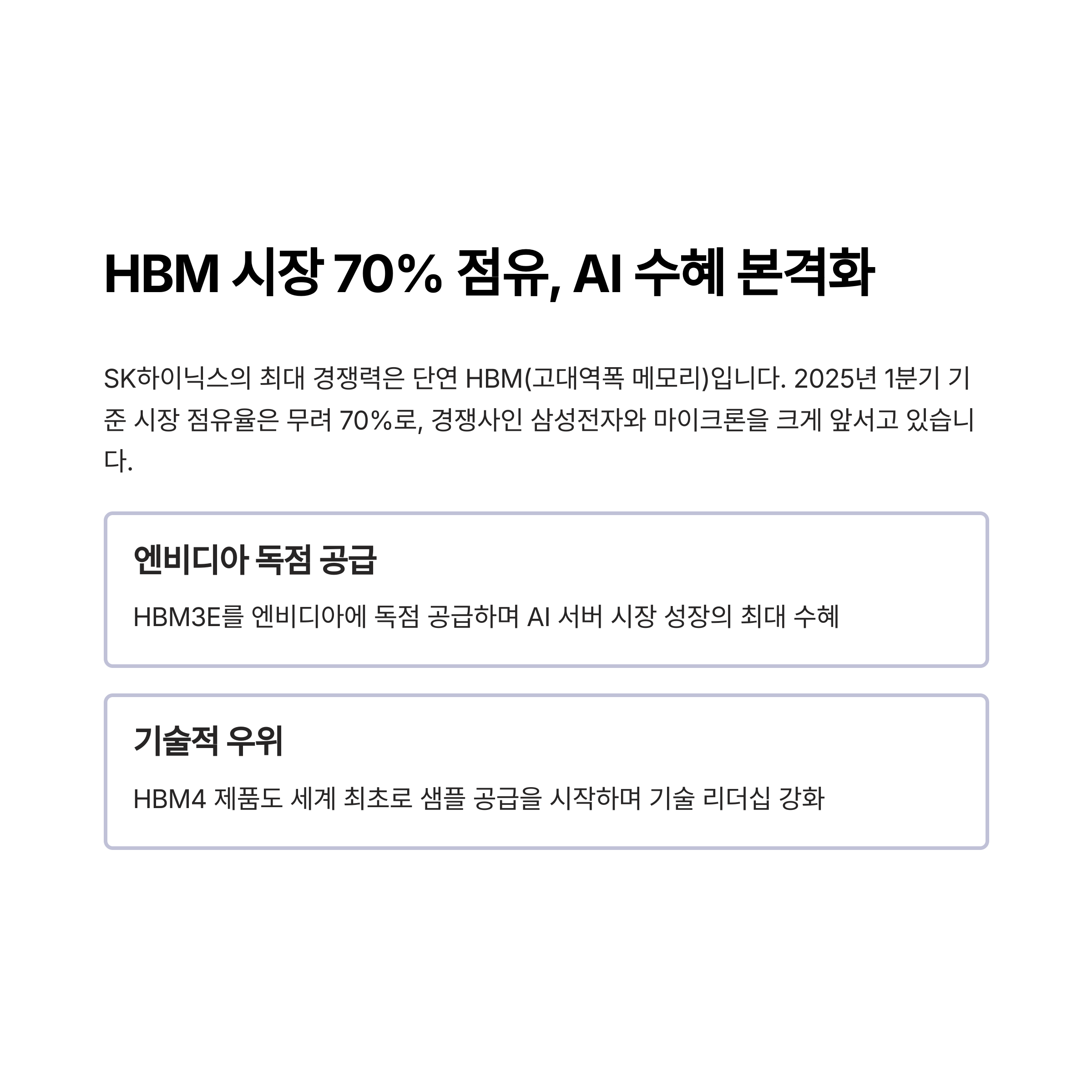 SK하이닉스의 최대 경쟁력은 단연 HBM(고대역폭 메모리)입니다. 2025년 1분기 기준 시장 점유율은 무려 70%로, 경쟁사인 삼성전자와 마이크론을 멀찍이 따돌리고 있습니다. 특히 엔비디아에 HBM3E를 독점 공급하며 AI 서버 시장 폭발적 성장의 최대 수혜 기업으로 꼽히는데요. 향후 HBM4 제품도 세계 최초로 샘플 공급을 시작하며 기술적 우위를 더욱 공고히 하고 있습니다.
