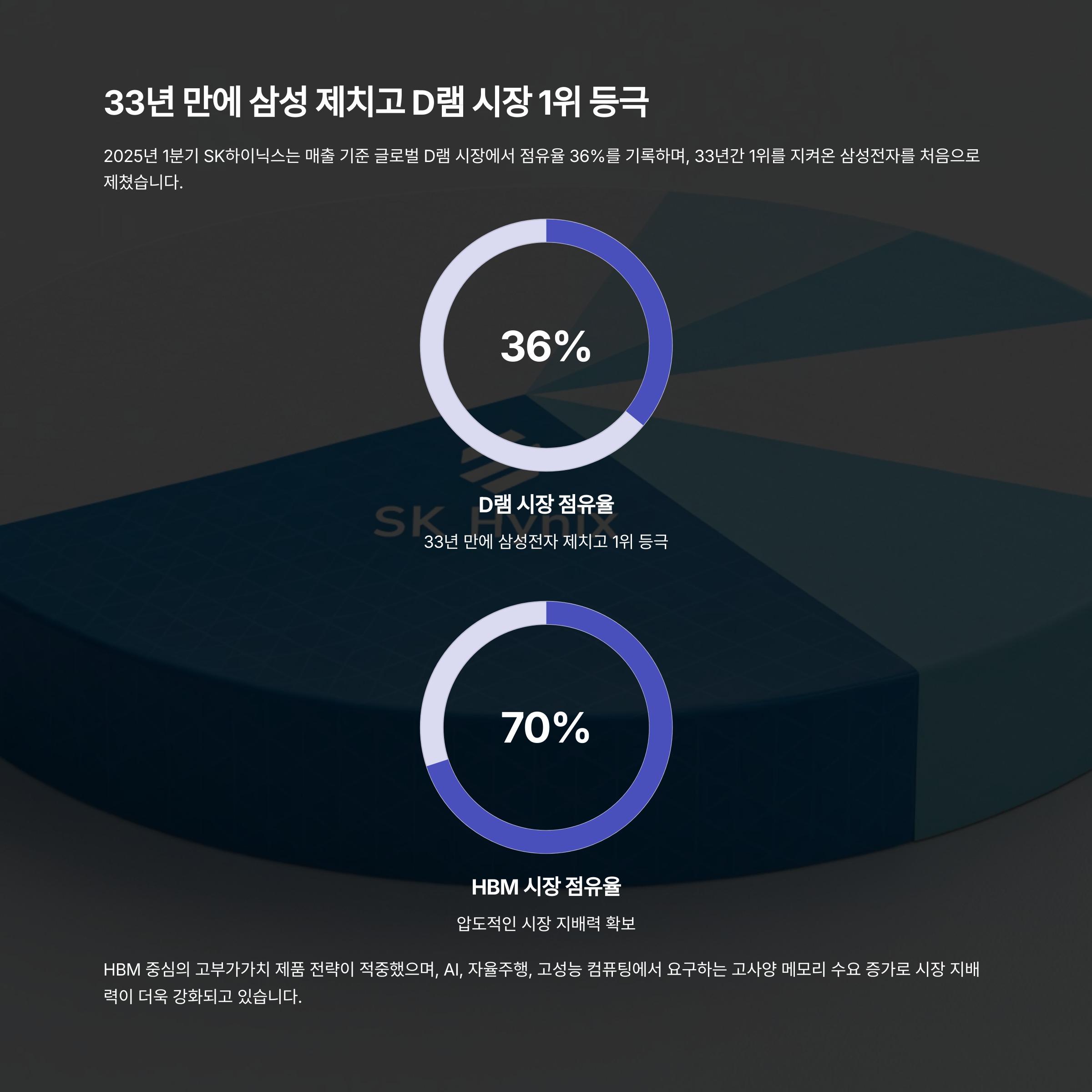 2025년 1분기 SK하이닉스는 매출 기준 글로벌 D램 시장에서 점유율 36%를 기록하며, 33년간 1위를 지켜온 삼성전자를 처음으로 제쳤습니다. 이는 HBM 중심의 고부가가치 제품 전략이 적중했기 때문입니다. AI, 자율주행, 고성능 컴퓨팅에서 요구하는 고사양 메모리 수요가 늘며 SK하이닉스의 시장 지배력이 더욱 강화되고 있습니다.