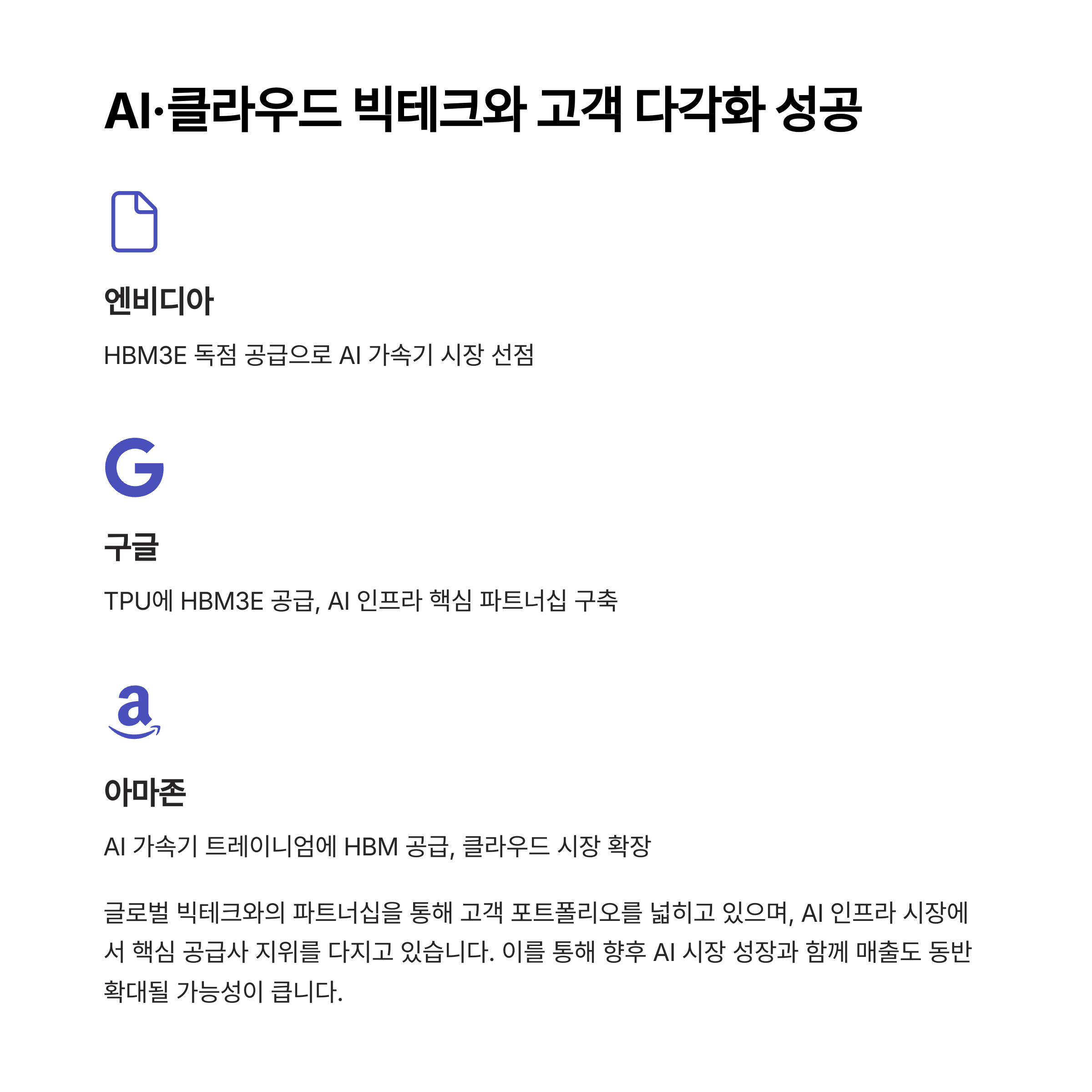 SK하이닉스는 엔비디아 외에도 아마존, 구글 등 글로벌 빅테크와의 파트너십을 통해 고객 포트폴리오를 넓히고 있습니다. 구글의 TPU, 아마존의 AI 가속기 트레이니엄에 HBM3E를 공급하며 AI 인프라 시장에서 핵심 공급사 지위를 다지고 있습니다. 이를 통해 향후 AI 시장 성장과 함께 매출도 동반 확대될 가능성이 큽니다.