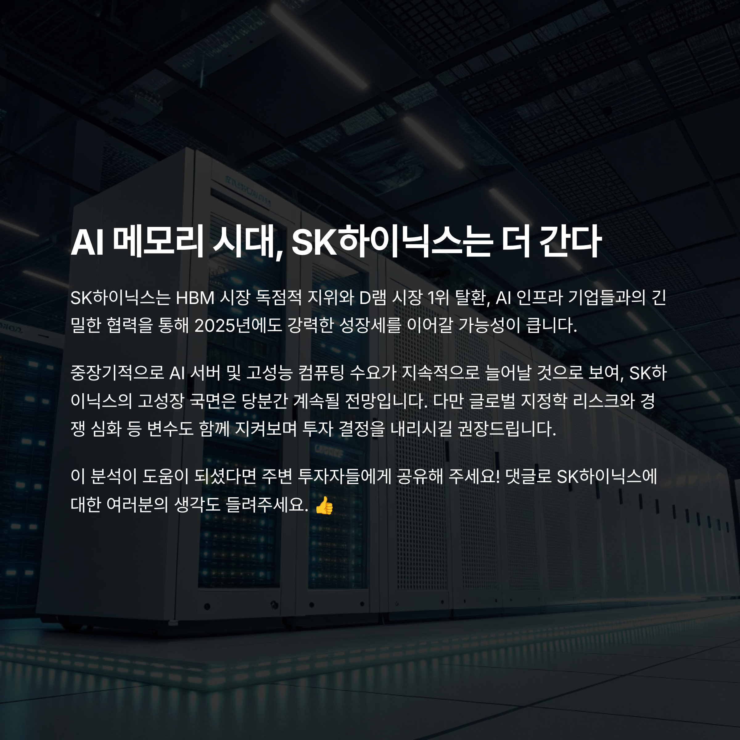 SK하이닉스는 HBM 시장 독점적 지위와 D램 시장 1위 탈환, AI 인프라 기업들과의 긴밀한 협력을 통해 2025년에도 강력한 성장세를 이어갈 가능성이 큽니다. 중장기적으로 AI 서버 및 고성능 컴퓨팅 수요가 지속적으로 늘어날 것으로 보여, SK하이닉스의 고성장 국면은 당분간 계속될 전망입니다. 다만 글로벌 지정학 리스크와 경쟁 심화 등 변수도 함께 지켜보며 투자 결정을 내리시길 권장드립니다.
