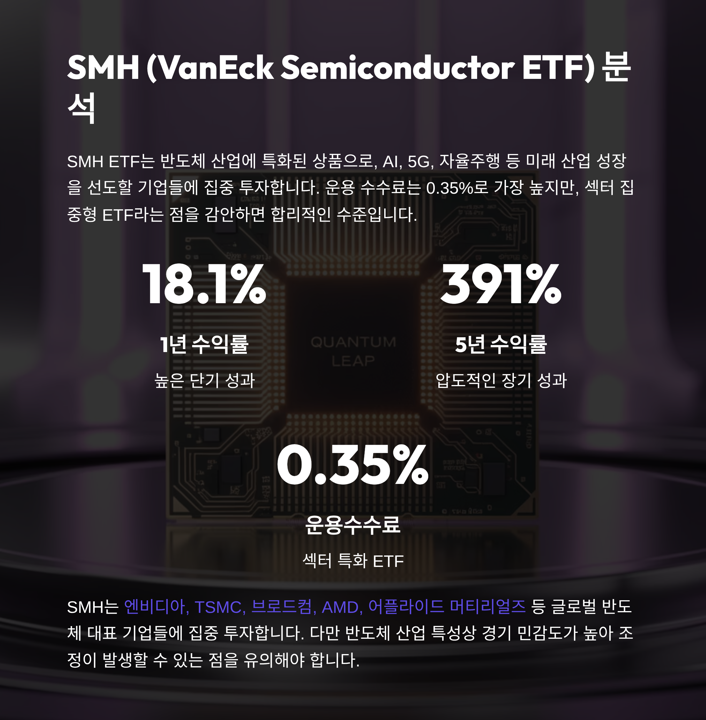 SMH ETF는 반도체 산업에 특화된 상품으로, AI, 5G, 자율주행 등 미래 산업 성장을 선도할 기업들에 집중 투자합니다. 운용 수수료는 0.35%로 가장 높지만, 섹터 집중형 ETF라는 점을 감안하면 합리적인 수준입니다.