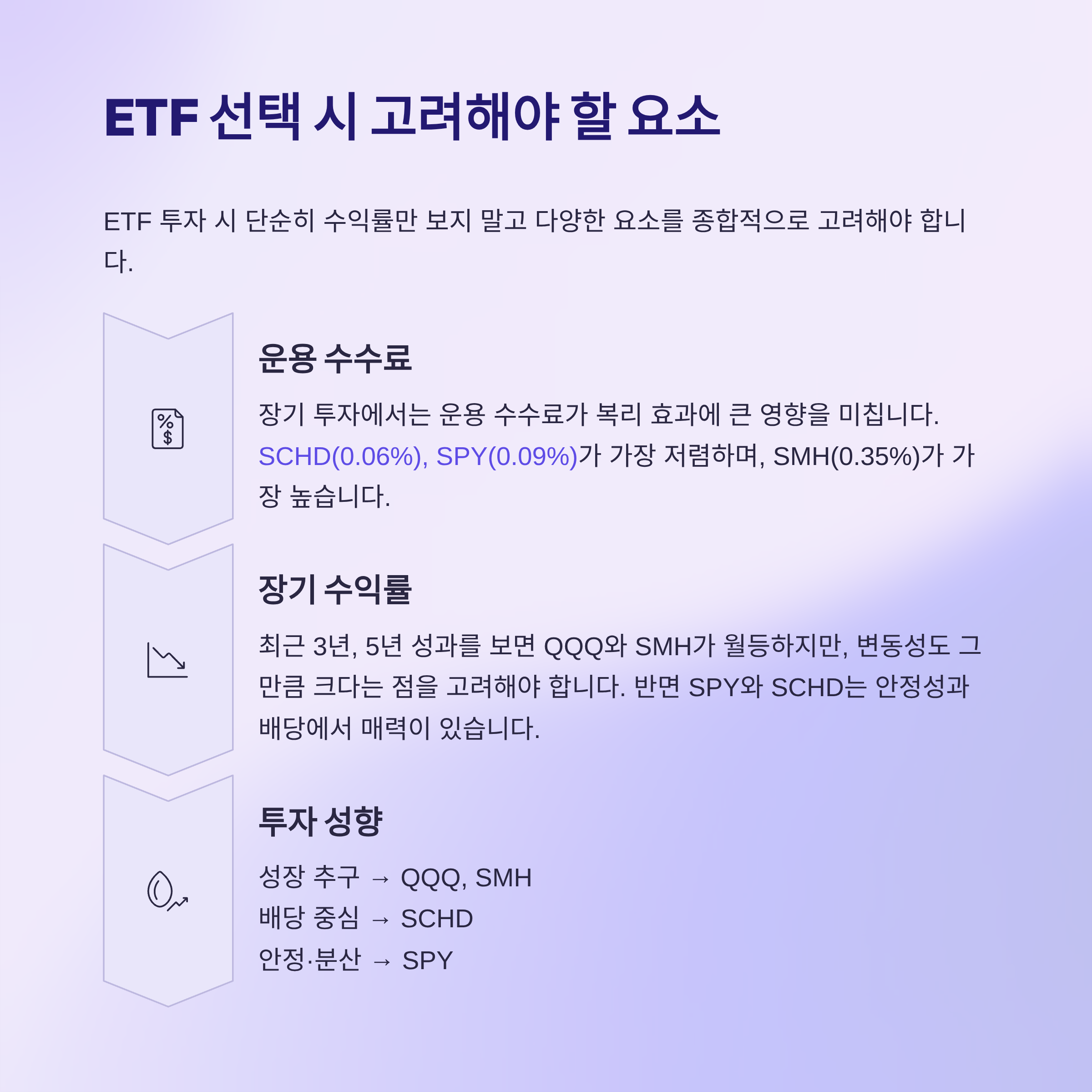 최근 3년, 5년 성과를 보면 QQQ와 SMH가 월등하지만, 변동성도 그만큼 크다는 점을 고려해야 합니다. 반면 SPY와 SCHD는 안정성과 배당에서 매력이 있습니다.