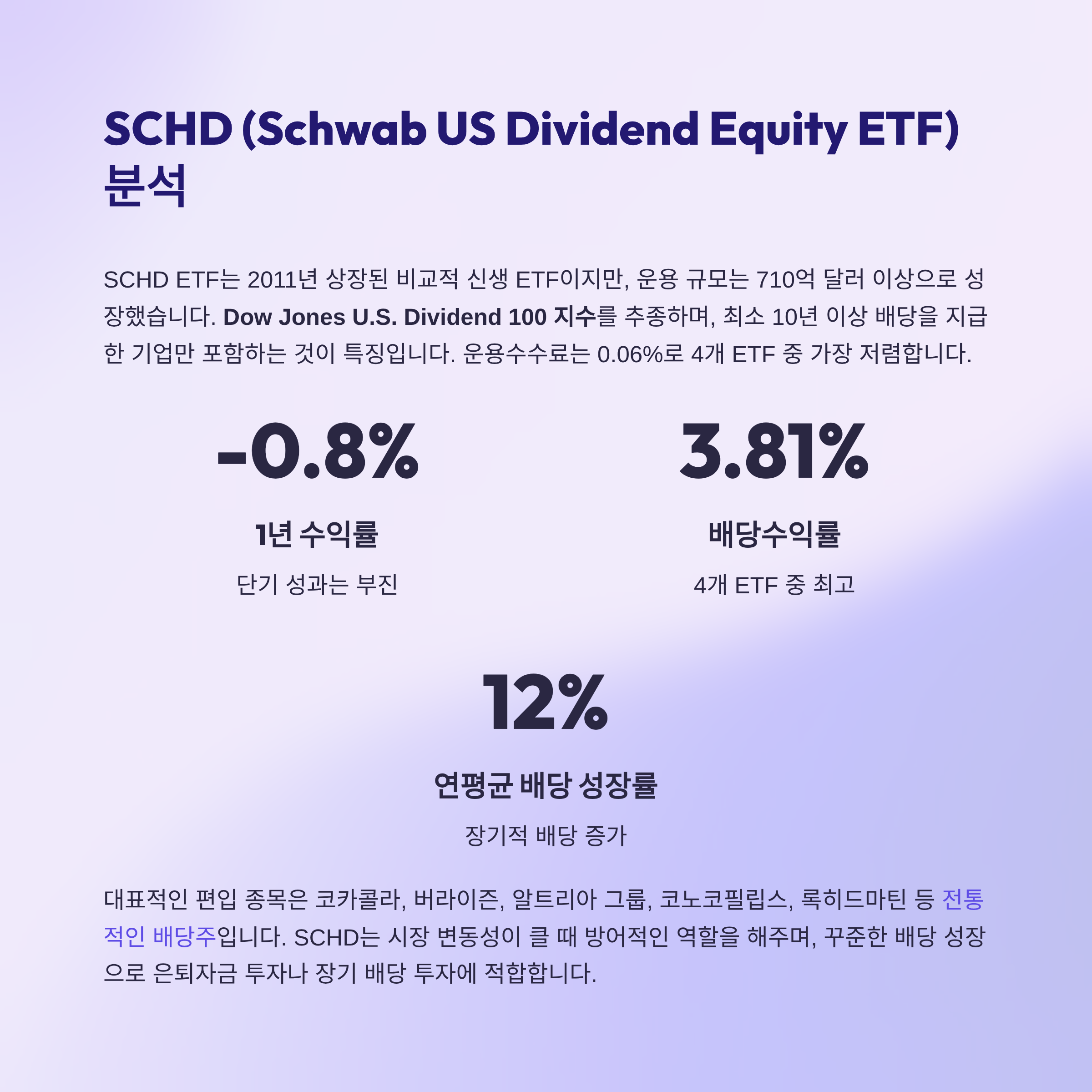 SCHD는 최근 1년 수익률이 -0.8%로 부진했지만, 배당수익률은 3.81%로 가장 높습니다. 장기적으로 배당 성장률이 연평균 12% 이상을 기록해 안정적인 배당 수익을 원하는 투자자에게 매력적입니다.