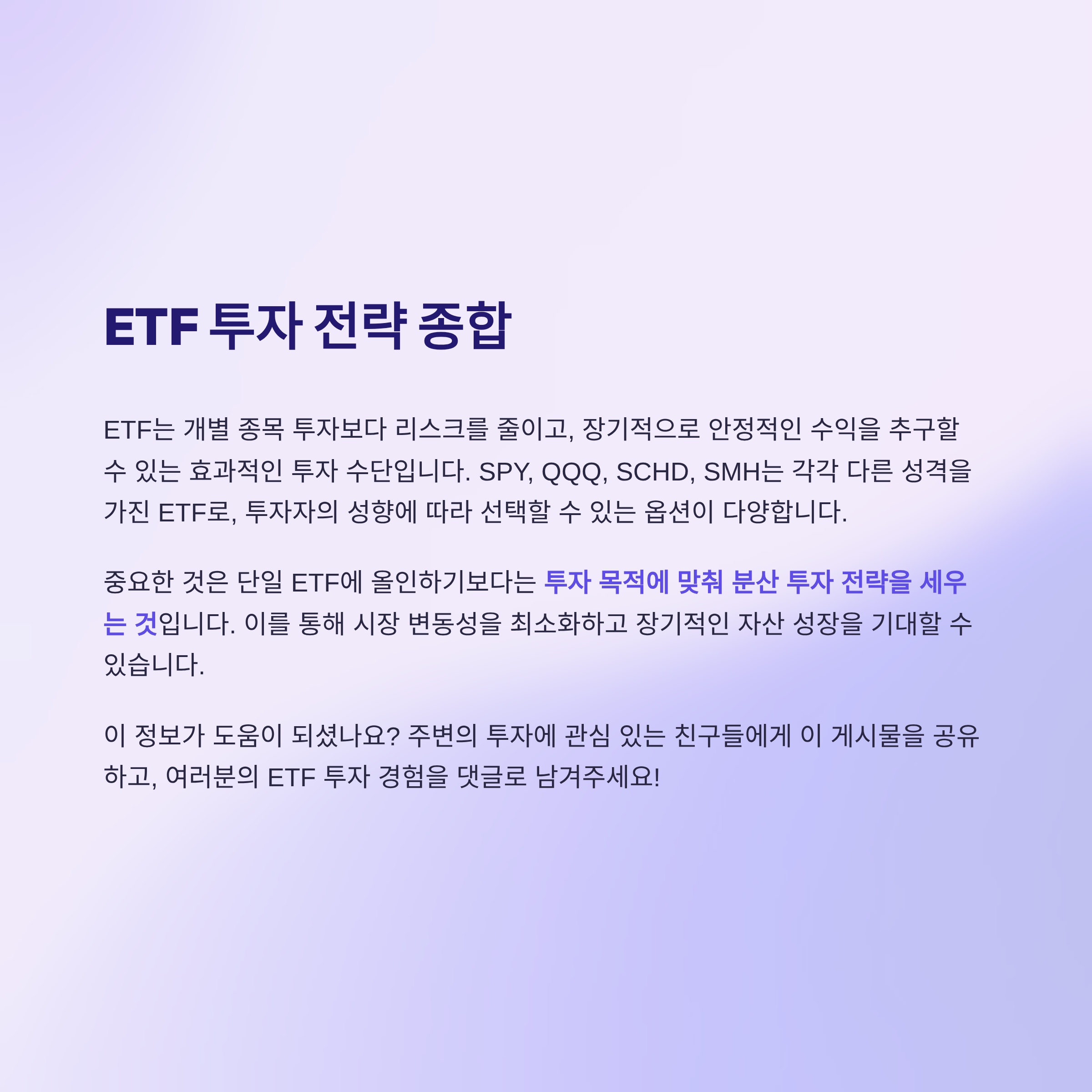 ✅ 결론: SPY, QQQ, SCHD, SMH ETF 투자 전략 종합