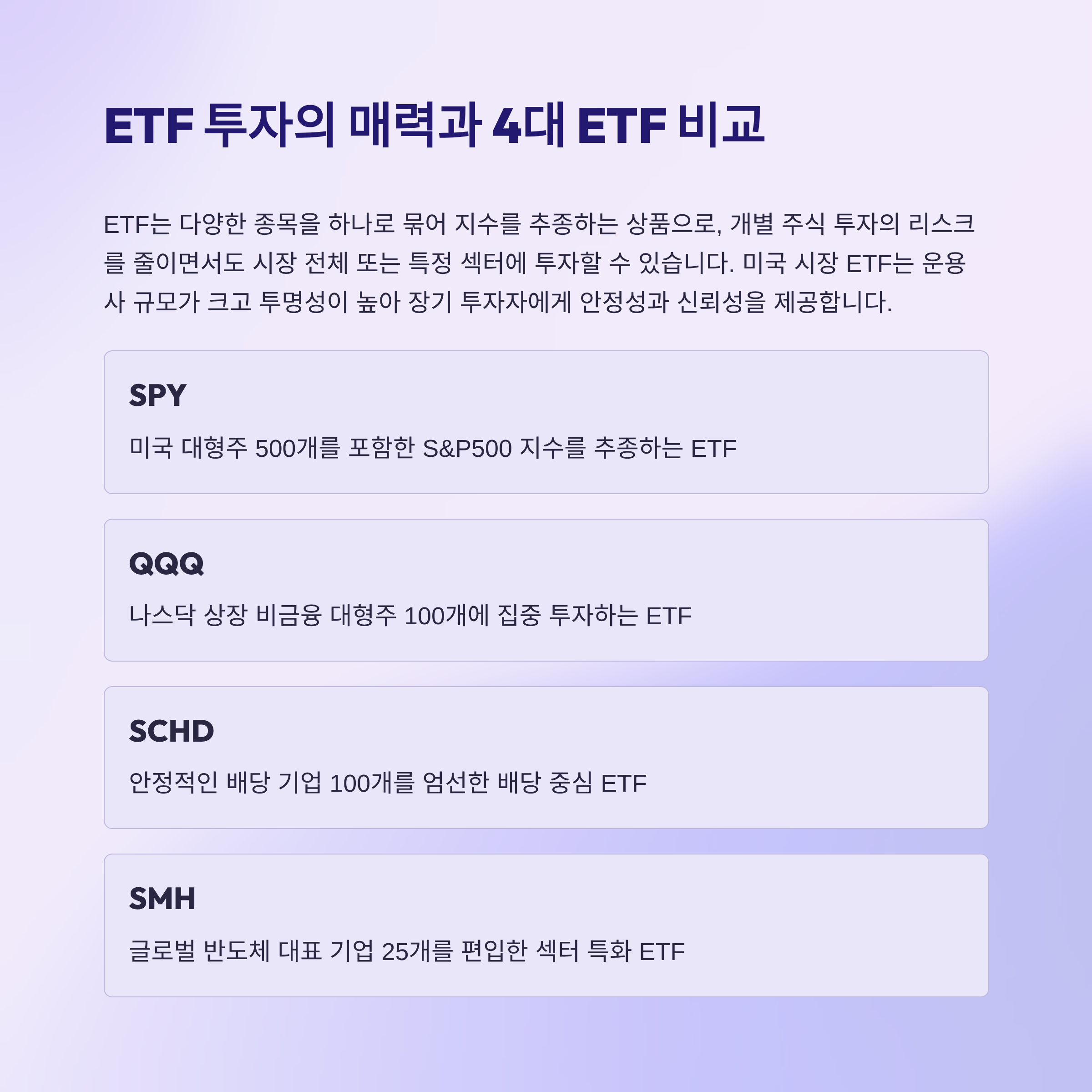 ETF는 다양한 종목을 하나로 묶어 지수를 추종하는 상품으로, 개별 주식에 투자하는 리스크를 줄이면서도 시장 전체 또는 특정 섹터에 투자할 수 있다는 장점이 있습니다. 특히 미국 시장 ETF는 운용사 규모가 크고 투명성이 높아 장기 투자자에게 안정성과 신뢰성을 제공합니다.