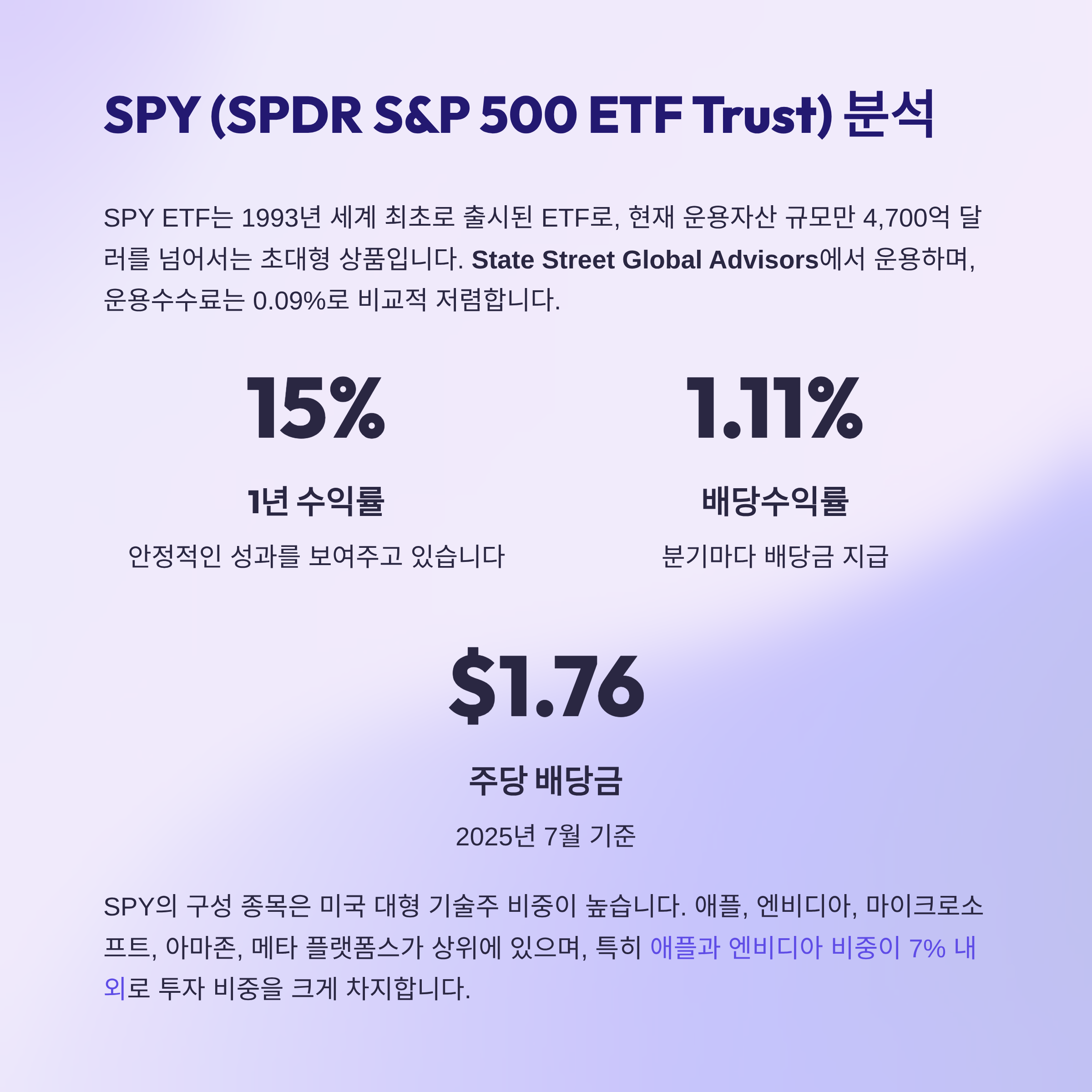 - 꾸준한 시장 평균 수익률과 안정적 배당을 원한다면 → SPY ETF